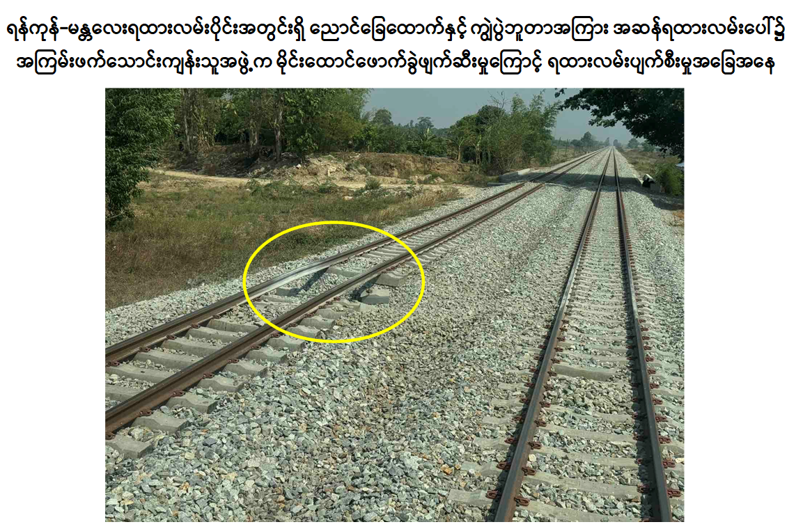 ထို့အတူ ယနေ့နံနက် ၉ နာရီ ၁၅ မိနစ်အချိန်တွင် ရန်ကုန်-မန္တလေး ရထားလမ်းပိုင်းအတွင်း ပဲခူးတိုင်းဒေသကြီး၊ အုတ်တွင်းမြို့နယ်၊ ညောင်ခြေထောက်ဘူတာနှင့် ကျွဲပွဲဘူတာအကြား၊ မိုင်တိုင်အမှတ် ၁၄၄/၁၀-၁၁ နေရာရှိ အဆန်ရထားလမ်းပေါ်တွင် အကြမ်းဖက်သောင်းကျန်းသူအဖွဲ့က ထောင်ထားသည့် မိုင်းပေါက်ကွဲမှုကြောင့် အဆန်ရထားလမ်း ထိခိုက်ပျက်စီးခဲ့ကြောင်းသတင်းအရ ညောင်ခြေထောက်ဘူတာနှင့် ကျွဲပွဲရထားလမ်းပိုင်းအား ဧကလမ်းစနစ်အသုံးပြု၍ အစုန်လမ်းမှ နံနက် ၉ နာရီ ၁၈ မိနစ်အချိန်တွင် ရထားများအား ဖြတ်သန်းခွင့်ပြုထားကြောင်း သတင်းရရှိသည်။