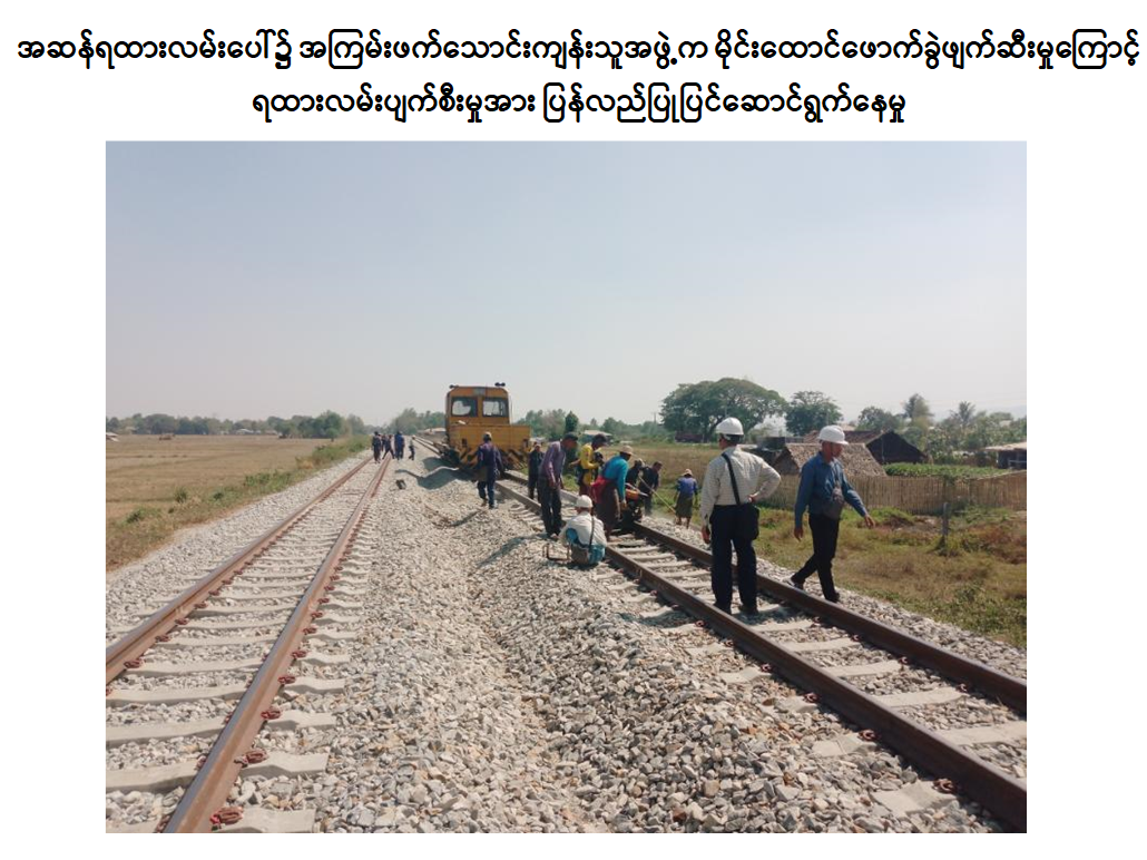 အကြမ်းဖက်သောင်းကျန်းသူအဖွဲ့များအနေဖြင့် ၂၀၂၁ ခုနှစ်၊ ဖေဖော်ဝါရီလမှစ၍ ယခုအချိန်အထိ မြန်မာ့မီးရထားလမ်းကွန်ရက်တစ်ခုလုံးတွင် ရထားလမ်းနှင့် ရထားဘူတာနယ်မြေအတွင်း မိုင်းထောင်ဖောက်ခွဲဖျက်ဆီးခြင်း(၈၀)ကြိမ်၊ ရထားတံတား/သံလမ်းများအား မိုင်းထောင်ဖောက်ခွဲ ဖျက်ဆီးခြင်း(၁၇၅)ကြိမ်၊ ဘူတာအဆောက်အဦနှင့် ဝန်ထမ်းနေအိမ်များအား မီးရှို့ဖျက်ဆီးခြင်း(၁၆) ကြိမ် ကျူးလွန်ခဲ့ကြသည်။