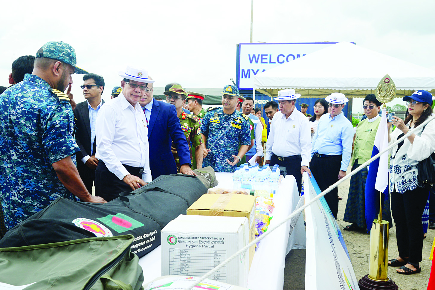ယနေ့ရောက်ရှိလာသည့် ဘင်္ဂလားဒေ့ရှ်ရေတပ်မှ စစ်ရေယာဉ်တွင် ကူညီကယ်ဆယ်ရေးပစ္စည်းများမှာ စားသောက်ဖွယ်ရာများ၊ ရွက်ဖျင်တဲ၊ အဝတ်အစား၊ သောက်ရေသန့်၊ တစ်ကိုယ်ရေသုံးပစ္စည်းများနှင့်ဆေးဝါးများ စသည်တို့ပါဝင်ပြီး စုစုပေါင်းတန်ချိန်(၁၂၀)တန်ခန့်ဖြစ်ကြောင်း သိရသည်။