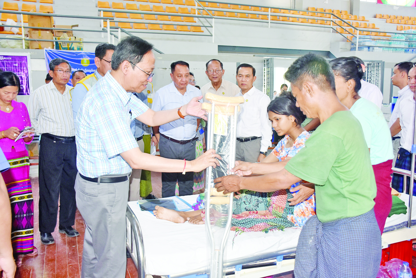 ဆက်လက်ပြီး ပြည်ထောင်စုဝန်ကြီးသည် ရွှေကြာပင်ယာယီ ဆေးရုံသို့သွားရောက်၍ လူနာများအား ရင်းရင်းနှီးနှီး လိုက်လံနှုတ်ဆက်အားပေးစကား ပြောကြားကာ ခြေ၊ လက်၊ ကျောရိုး ထိခိုက်သူများအား လိုအပ်သော ချိုင်းထောက်များ၊ လေးချောင်း ထောက်များနှင့် ငလျင်ဒဏ်ကြောင့် ခြေထောက်နှစ်ဖက်လုံး ဖြတ်ထားသည့်လူနာအား ဘီးတပ်ကုလားထိုင် ထောက်ပံ့ပေးအပ်သည်။ အဆိုပါဆေးရုံတွင် တပ်မတော် ဆေးတပ်ဖွဲ့၊ နေပြည်တော် အရိုး အထူးကုဆေးရုံကြီး၊ နေပြည်တော် နား၊ နှာခေါင်း၊ လည်ချောင်း အထူးကု ဆေးရုံကြီးနှင့် ရန်ကုန်တိုင်းဒေသကြီးရှိ ပြည်သူ့ဆေးရုံကြီးများမှ အထူးကုဆရာဝန်များ ပါဝင်သော ဆေးအဖွဲ့များပူးပေါင်း၍ ကျန်းမာရေး စောင့်ရှောက်မှုများ ဆောင်ရွက်ပေးလျက်ရှိသည်။