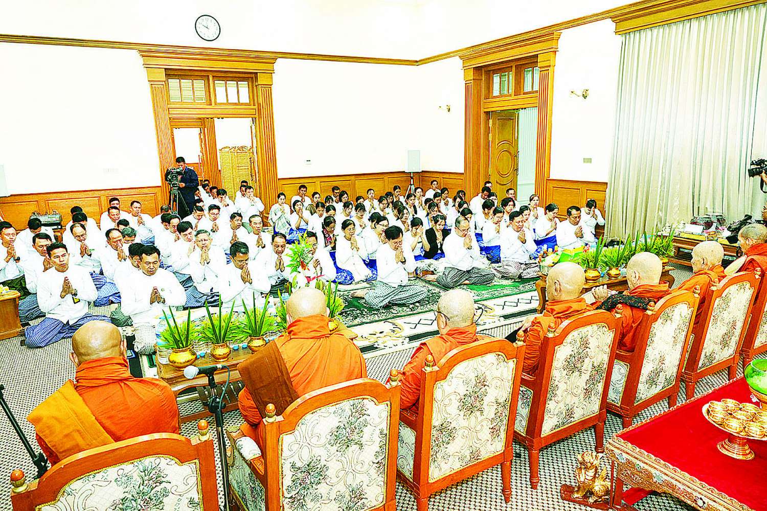 ထို့နောက် နိုင်ငံတော်သြဝါဒါစရိယ၊ နေပြည်တော်ကောင်စီနယ်မြေ တပ်ကုန်းမြို့ မဟာသီဟနာ ဒကျောင်းတိုက် ဆရာတော် အဘိဓဇမဟာရဋ္ဌဂုရု ဘဒ္ဒန္တအာစိဏ္ဏထံမှ နိုင်ငံတော်စီမံအုပ်ချုပ်ရေးကောင်စီ အတွင်းရေးမှူးနှင့် ဧည့်ပရိသတ်များက ကိုးပါးသီလ ခံယူဆောက်တည်ကြပြီး သံဃာတော်အရှင်သူမြတ်များရွတ်ပွား သရဇ္ဈာယ်တော်မူသော အန္တရာယ်ကင်းပရိတ် တရားတော် များနှင့်အနန္တရာယိက ကမ္မဝါစာများကို နာယူကြည်ညိုကြသည်။