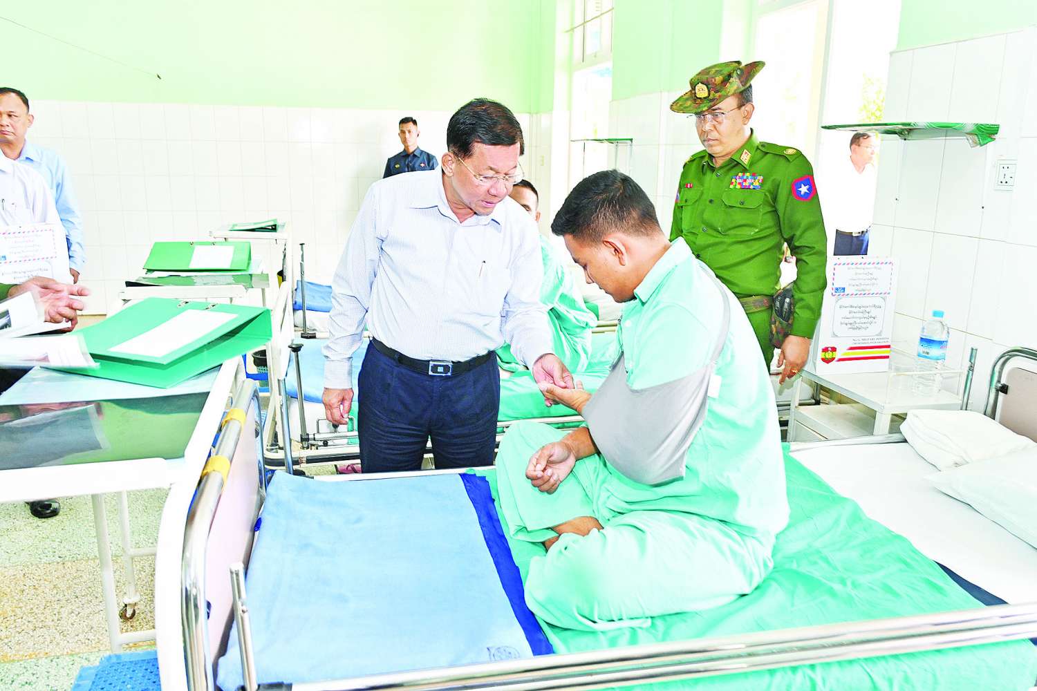 ယင်းနောက် နိုင်ငံတော်စီမံအုပ်ချုပ်ရေးကောင်စီဥက္ကဋ္ဌ နိုင်ငံတော်ဝန်ကြီးချုပ်နှင့် ဇနီး၊ အဖွဲ့ဝင်များသည် ဆေးရုံ၌တက်ရောက်ကုသမှုခံယူလျက်ရှိသည့် နိုင်ငံတော်ကာကွယ်ရေးနှင့် လုံခြုံရေးတာဝန်များထမ်းဆောင်စဉ် ထိခိုက်ဒဏ်ရာရရှိခဲ့သော အရာရှိ၊ စစ်သည်များ၏ ထိခိုက်ဒဏ်ရာရရှိခဲ့မှု အခြေအနေများ၊ ရောဂါကုသပျောက် ကင်းမှုအခြေအနေများကို တစ်ဦးချင်းလိုက်လံတွေ့ဆုံ၍ ရင်းနှီးနွေးထွေးစွာ မေးမြန်းအားပေးစကားပြောကြားကာ အရာရှိ၊ စစ်သည်များ၏ တင်ပြချက်များအပေါ် လိုအပ်သည်များ ဖြည့်ဆည်းဆောင်ရွက်ပေးသည်။