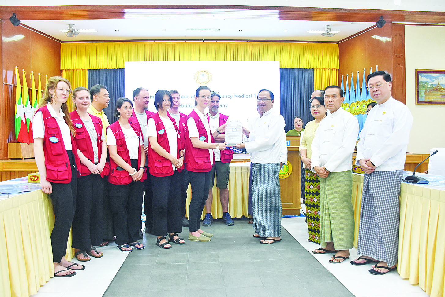 ထို့နောက် အမျိုးသားသဘာဝဘေးအန္တရာယ်ဆိုင်ရာ စီမံခန့်ခွဲမှုကော်မတီအဖွဲ့ဝင် ပြည်ထောင်စုဝန်ကြီးက မြန်မာနိုင်ငံ၏ ငလျင်ဘေးတုံ့ပြန်ရေးအတွက် နိုင်ငံပေါင်း ၁၆ နိုင်ငံမှ အရေးပေါ်ဆေးအဖွဲ့ ၂၃ ဖွဲ့မှ ကျန်းမာရေးစောင့်ရှောက်မှုလုပ်ငန်းများအား ပူးပေါင်းကူညီဆောင်ရွက်ပေးခဲ့ကြောင်း၊ ဂျာမနီနိုင်ငံ အရေးပေါ်ဆေးကုသရေးအဖွဲ့ (Humedica) သည် ဧပြီ ၁၅ ရက်မှစတင်ကာ နေပြည်တော်ပြည်သူ့ဆေးရုံကြီး ခုတင်-၃၀၀ တွင် အခြေပြု၍ ငလျင်ဘေးအရေးပေါ် ကျန်းမာရေးစောင့်ရှောက်မှုလုပ်ငန်းများကို ပူးပေါင်းဆောင်ရွက်ခဲ့ပြီး အရေးပေါ်နှင့်ပြင်ပလူနာပေါင်း ၁၀၀၀ နီးပါးကို ဆေးကုသမှုများဆောင်ရွက်ပေးခြင်းနှင့် လူနာများအတွက် လိုအပ်သည့်ပစ္စည်းများကို ပံ့ပိုးပေးခဲ့သဖြင့် နိုင်ငံတော်အစိုးရနှင့် ပြည်သူလူထုကိုယ်စား ဂျာမနီနိုင်ငံအစိုးရ၊ ပြည်သူလူထုနှင့် Humedica အဖွဲ့အား အထူးကျေးဇူးတင်ရှိကြောင်း၊ ကျန်းမာရေးဝန်ကြီးဌာနအနေဖြင့် နိုင်ငံတော်ဝန်ကြီးချုပ်၏ လမ်းညွှန်မှုနှင့်အညီ ငလျင်ဘေးသင့်ဒေသများတွင် ဘက်စုံကျန်းမာရေးစောင့် ရှောက်မှုလုပ်ငန်းများနှင့် ငလျင်ဒဏ်ကြောင့် ထိခိုက်ခံစားရသူများနှင့် ကိုယ်လက်အင်္ဂါဆုံးရှုံးခဲ့သူများအတွက် လိုအပ်သည့် ကျန်းမာရေးဆိုင်ရာ ပြန်လည်ထူထောင်ရေးအတွက် ဆောင်ရွက်လျက်ရှိကြောင်းပြောကြားပြီး ဂျာမနီနိုင်ငံ အရေးပေါ်ဆေးအဖွဲ့အား ဂုဏ်ပြုမှတ်တမ်းတင်လွှာနှင့် အမှတ်တရလက်ဆောင်များ ပေးအပ်သည်။