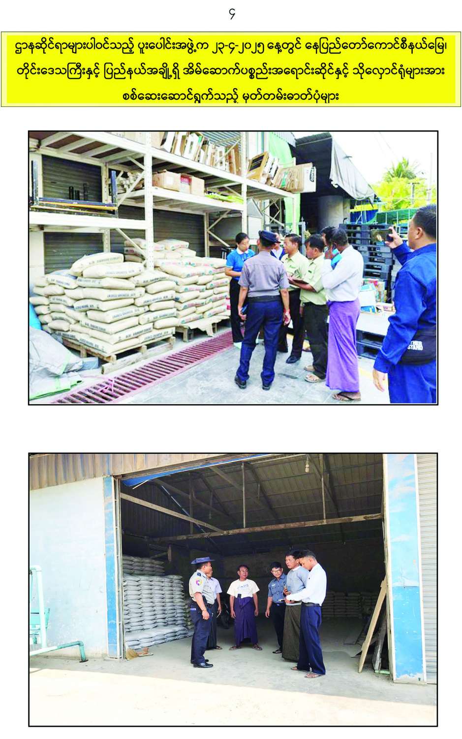 သို့ရာတွင် အချို့သောစီးပွားရေး လုပ်ငန်းရှင်များက လိုက်နာဆောင်ရွက်မှုမရှိဘဲ မတော်လောဘဖြင့် ဆောက်လုပ်ရေးလုပ်ငန်းသုံးပစ္စည်းများကို ဈေးနှုန်းအဆမတန် မြှင့်တင်ရောင်းချမှုများ ဆက်လက်ပြုလုပ်လျက်ရှိကြောင်း သိရှိရသဖြင့် ငလျင်ဒဏ်သင့်ဒေသများအပါအဝင် မြို့ကြီးအချို့၌ ရောင်းဝယ်လျက်ရှိသည့် ဆောက်လုပ်ရေးလုပ်ငန်းသုံးပစ္စည်း အရောင်းဆိုင်/သိုလှောင်ရုံ၊ ဆောက်လုပ်ရေးလုပ်ငန်းသုံး ပစ္စည်းတင်သွင်းဖြန့်ဖြူးရောင်းချ သည့်ကုမ္ပဏီများကို တာဝန်ရှိသူများက ဧပြီ ၂၃ ရက်တွင် ကွင်းဆင်းစစ်ဆေးဆောင်ရွက်ခဲ့သည်။