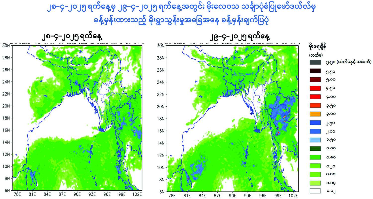 ယနေ့ညနေ ၅ နာရီခွဲအချိန် တိုင်းထွာချက်များအရ အနောက်ဘက်မှ ရွေ့လျားလာသော လေပွေလှိုင်းများ၏ အရှိန်ကြောင့်လည်းကောင်း၊ အရှေ့ဘက်မှ ရွေ့လျားလာသော လေပွေလှိုင်းများ၏ အရှိန်ကြောင့်လည်းကောင်း၊ ကပ္ပလီပင်လယ်ပြင်နှင့်ဘင်္ဂလားပင်လယ်အော်တို့မှ လေနွေးများနှင့် တရုတ်ပြည်မကြီးပေါ်ရှိ လေဖိအားကြီးရပ်ဝန်းဒေသမှ ရွေ့လျားလာသော လေအေးများတွေ့ဆုံမှုကြောင့် လည်းကောင်း ဧပြီ ၂၈ ရက်မှ မေ ၃ ရက်အတွင်း နေပြည်တော်၊ ရန်ကုန်တိုင်းဒေသကြီး၊ မန္တလေးတိုင်းဒေသကြီး၊ ပဲခူးတိုင်းဒေသကြီး၊ မကွေးတိုင်းဒေသကြီး၊ စစ်ကိုင်းတိုင်းဒေသကြီး၊ ဧရာဝတီတိုင်းဒေသကြီး၊ တနင်္သာရီတိုင်းဒေသကြီး၊ ကချင်ပြည်နယ်၊ ကယားပြည်နယ်၊ ကရင်ပြည်နယ်၊ ချင်းပြည်နယ်၊ မွန်ပြည်နယ်၊ ရခိုင်ပြည်နယ်နှင့် ရှမ်းပြည်နယ်တို့တွင် နေရာကျဲကျဲမှ နေရာစိပ်စိပ် မိုးထစ်ချုန်းရွာပြီး အချို့ဒေသများတွင် နေရာကွက်၍ မိုးကြီးနိုင်သည်။