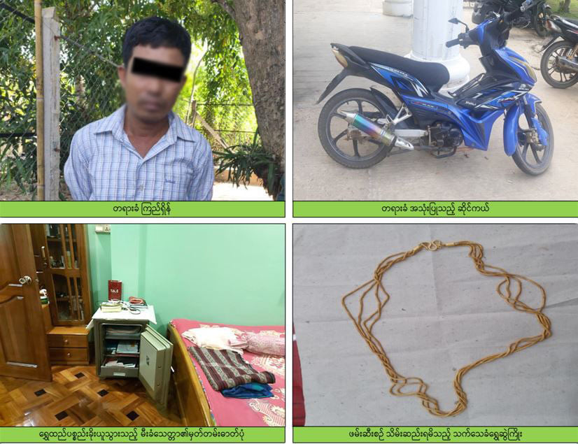မြန်မာနိုင်ငံရဲတပ်ဖွဲ့၊ မှုခင်းရဲတပ်ဖွဲ့နှင့် နေပြည်တော်ရဲတပ်ဖွဲ့ဝင်များက တရားခံဖော် ထုတ်နိုင်ရေး စုံစမ်းထောက်လှမ်းနေချိန် အောက်တိုဘာ ၁၃ ရက်တွင် တရားခံဟုယူဆရသူ သည် သပြေကုန်းဈေးအတွင်းရှိ ရွှေဆိုင်တစ်ဆိုင်သို့ ရွှေဆွဲကြိုးလာရောက်ပေါင်နှံရာ ရွှေဝယ် ဘောင်ချာ မပါရှိသဖြင့် ဆိုင်မှလက်မခံသောကြောင့် ဆိုင်ကယ်ဖြင့် ပြန်လည်ထွက်ခွါသွား ကြောင်း သတင်းရရှိခဲ့ပြီး ရဲတပ်ဖွဲ့ဝင်များက CCTV မှတ်တမ်းများအရ စီးနင်းလာသည့် ဆိုင်ကယ်နံပါတ်နှင့် လူပုံသဏ္ဍာန်အား စိစစ်ရရှိခဲ့ ကြောင်း၊ ယနေ့တွင် ယင်းနံပါတ်ပါ ဆိုင်ကယ်၏သွားလာလှုပ်ရှား မှုကို စောင့်ကြည့်နေစဉ် အဆိုပါ မသင်္ကာတရားခံသည် မြို့မဈေးရှိ ရွှေဆိုင်တစ်ဆိုင်သို့ ရွှေဆွဲကြိုး တစ်ကုံးအား ထပ်မံလာ ရောက်ရောင်းချသည်ကို တွေ့ရှိရ၍ ဥပဒေနှင့်အညီဖမ်းဆီးစစ်ဆေးခဲ့ရာ ၎င်းမှာ ဒက္ခိဏသီရိမြို့နယ်၊ ထန်းတပင်ကျေးရွာ နေ ကြည်ရှိန်(၄၆)နှစ်၊ ဖြစ်ပြီး ၎င်းရောင်းချ သည့် ရွှေဆွဲကြိုး မှာ ပုဗ္ဗသီရီမြို့နယ်၊ သပြေလမ်းနေ ဒေါ်မော်မော်လွင်စိုးအား သတ်၍ နေအိမ်မှခိုးယူသွားသည့် ရွှေထည်ပစ္စည်းဖြစ်သည်ကို စစ်ဆေးပေါ်ပေါက်ခဲ့ကြောင်း။