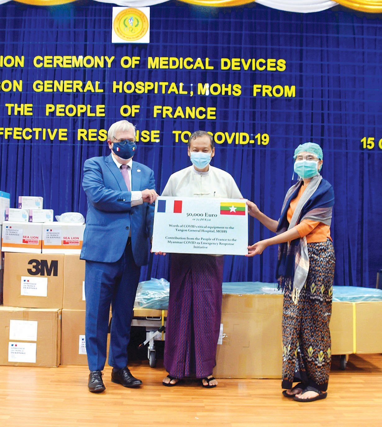 ယနေ့ လှူဒါန်းပွဲတွင် ပြင်သစ်နိုင်ငံမှ ကျန်းမာရေးနှင့် အားကစားဝန်ကြီးဌာန၊ ရန်ကုန်ပြည်သူ့ဆေးရုံကြီး၌ ကိုဗစ်- ၁၉ ရောဂါကုသရေးတွင် အသုံးပြုရန်အတွက် ယူရိုငွေ ၅၀၀၀၀ နှင့်ညီမျှသော ဆေးပစ္စည်းကိရိယာများကို လှူဒါန်းခဲ့ခြင်းဖြစ်ကြောင်း သိရသည်။