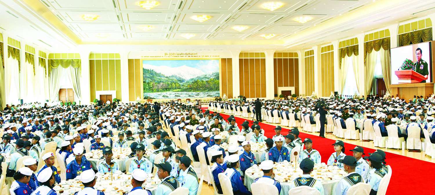 ဦးစွာ နိုင်ငံတော်စီမံအုပ်ချုပ်ရေးကောင်စီဥက္ကဋ္ဌ တပ်မတော်ကာကွယ်ရေးဦးစီးချုပ်က ဂုဏ်ပြုအမှာစကားပြောကြားရာတွင် နှစ်စဉ်နွေရာသီကျောင်းပိတ်ရက်ရှည်ကာလတွင် မိမိတို့၏ကိုယ်ပိုင်အချိန်များကို အကျိုးမဲ့မဖြစ်စေဘဲ မိမိအတွက်သော်လည်းကောင်း၊ တိုင်းပြည်အတွက်သော်လည်းကောင်း အကျိုးရှိစေသည့် ရေကြောင်း၊ လေကြောင်းပညာရပ်ဆိုင်ရာ လူငယ်သင်တန်းအသီးသီးကို လေ့လာသင်ယူတက်ရောက်ခဲ့ကြသည့် နိုင်ငံတစ်ဝန်းမှ မောင်မယ်များနှင့် တွေ့ဆုံပြီး ဂုဏ်ပြုအမှာစကား ပြောကြားခြင်းဖြစ်ကြောင်း။