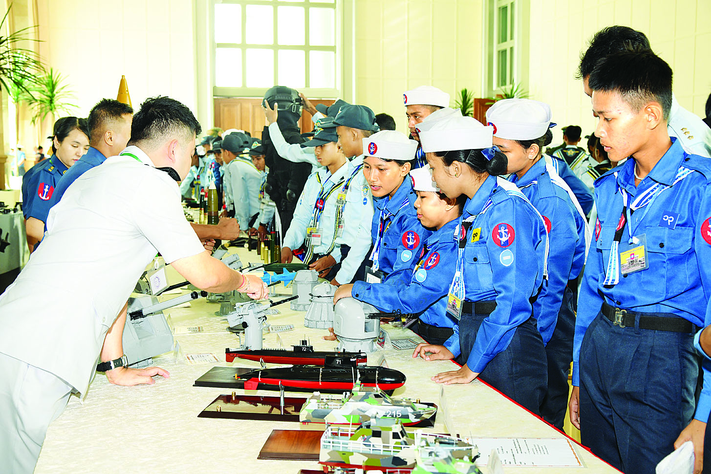 ရေကြောင်းနှင့် လေကြောင်းလူငယ်မောင်မယ်များသည် ဂုဏ်ပြုတွေ့ဆုံပွဲအခမ်းအနားသို့ မတက်ရောက်မီ ဇေယျာသီရိဗိမာန်အတွင်း ခင်းကျင်းပြသထားသော မြန်မာ့တပ်မတော်မှ ထုတ်လုပ်သည့်လက်နက်များ၊ တပ်မတော် (ကြည်း၊ ရေ၊ လေ)တွင် ဝတ်ဆင်အသုံးပြုနေသည့် ဝတ်စုံအမျိုးမျိုး၊ မြန်မာ့တပ်မတော်မှ ထုတ်လုပ်သည့် ဆက်သွယ်ရေးစက်ပစ္စည်းများ၊ တပ်မတော် (ရေ) မှ ထုတ်လုပ်သည့် ရေယာဉ်များ၏ပုံစံငယ်များ၊ ရေတပ်ဆိုင်ရာ အသုံးအဆောင်ပစ္စည်းများ၊ တပ်မတော် (လေ) တွင် အသုံးပြုနေသည့် လေယာဉ်နှင့် ရဟတ်ယာဉ်များ၏ ပုံစံငယ်များ၊ လေသူရဲများ၏ ဝတ်စုံများနှင့် အသုံးအဆောင်ပစ္စည်းများ၊ Simulator ဖြင့် လေယာဉ်ပျံသန်းမှု သရုပ်ပြကွက်များကို စိတ်ပါဝင်စားစွာ လှည့်လည်ကြည့်ရှုလေ့လာကြရာ တာဝန်ရှိသူများက သိရှိလိုသည်များကို ရှင်းလင်းပြသခဲ့ကြကြောင်း သတင်းရရှိသည်။