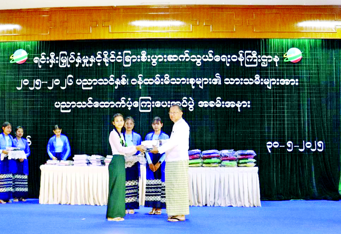 ဆက်လက်၍ ဒုတိယဝန်ကြီး ဒေါက်တာဝါဝါမောင်က အလယ်တန်း ကျောင်းသား ကျောင်းသူများအား ကျောင်းဝတ်စုံများကိုပေးအပ်ပြီး ညွှန်ကြားရေးမှူးချုပ်များက မူလတန်း ကျောင်းသား ကျောင်းသူ များအား ကျောင်းသုံးပစ္စည်းများကို ပေးအပ်ကြသည်။