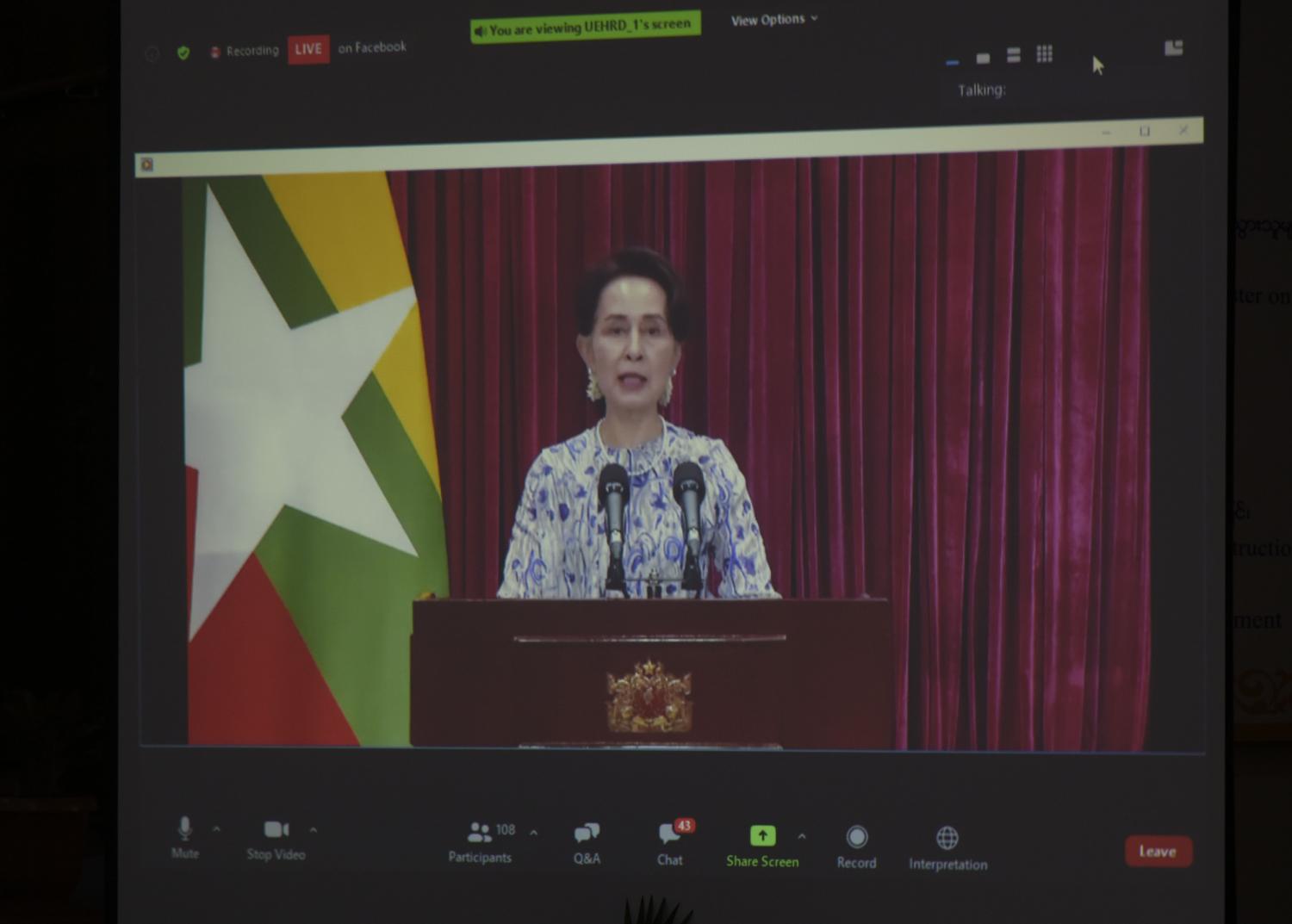အခမ်းအနားတွင် UEHRD ကော်မတီဥက္ကဋ္ဌ၊ နိုင်ငံတော်၏အတိုင်ပင်ခံပုဂ္ဂိုလ် ဒေါ်အောင်ဆန်းစုကြည်၏ အဖွင့်မိန့်ခွန်း Video Message ကို ထုတ်လွှင့်ပြသသည်။