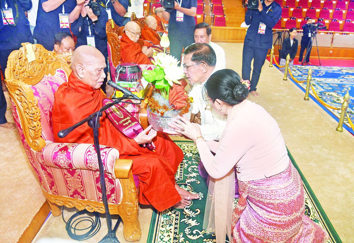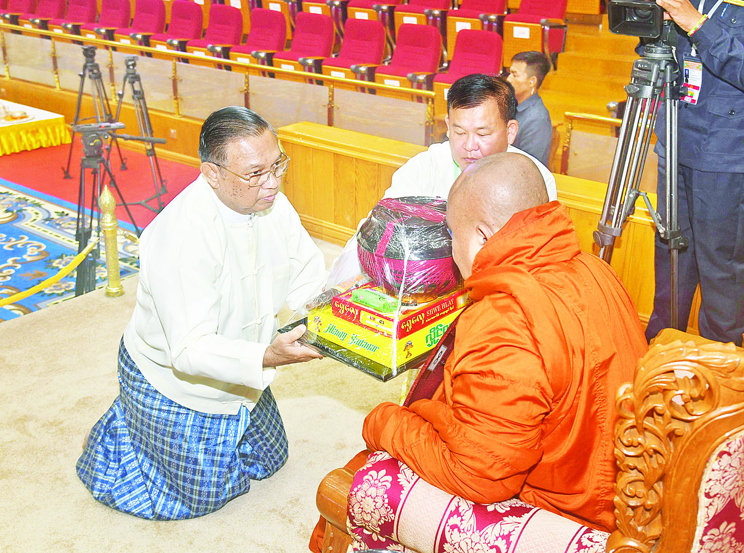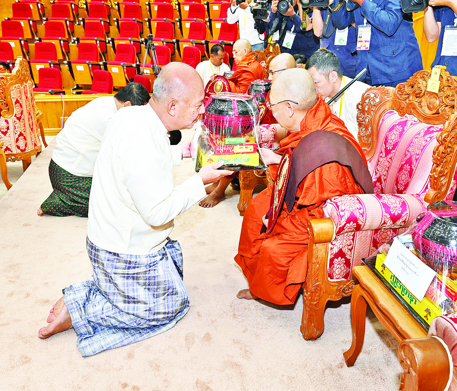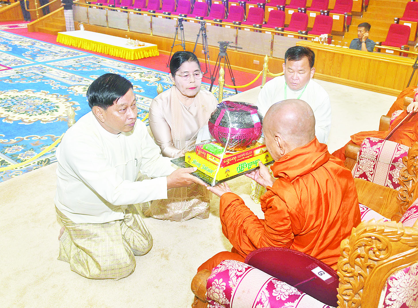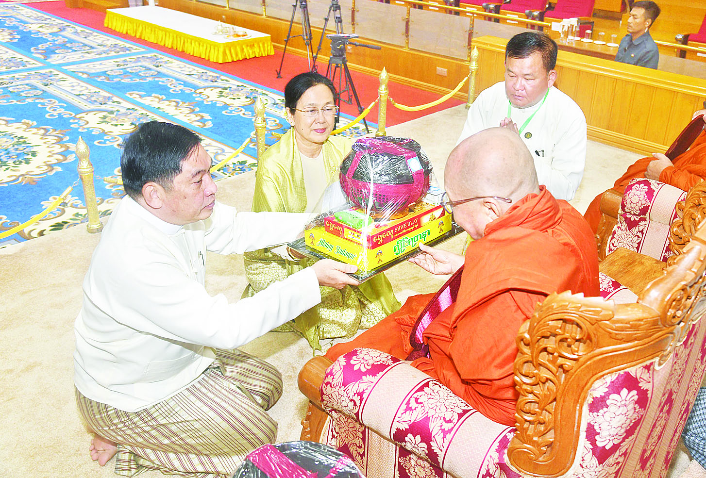 ယင်းနောက် နိုင်ငံတော်စီမံအုပ်ချုပ်ရေးကောင်စီဒုတိယဥက္ကဋ္ဌ ဒုတိယဝန်ကြီးချုပ်နှင့် ဇနီးတို့က မစိုးရိမ်တိုက်သစ်ဆရာတော်ကြီးထံ ဝါဆိုသင်္ကန်းနှင့် လှူဖွယ်ပစ္စည်းများကို ဆက်ကပ်လှူဒါန်းသည်။ ဆက်လက်၍ ကောင်စီအတွင်းရေးမှူးနှင့်ဇနီး၊ တွဲဖက်အတွင်းရေးမှူးနှင့်ဇနီး၊ ကောင်စီဝင်များနှင့်ဇနီးများ၊ ပြည်ထောင်စုအဆင့်ပုဂ္ဂိုလ်များက ဆရာတော်၊ သံဃာတော်များထံ ဝါဆိုသင်္ကန်းနှင့် လှူဖွယ်ပစ္စည်းများကို အသီးသီးဆက်ကပ်လှူဒါန်းကြသည်။