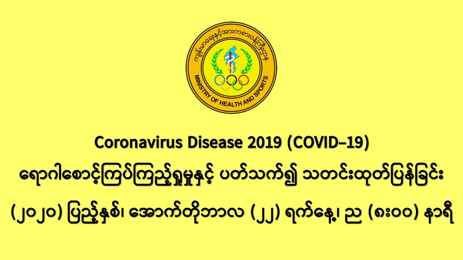 (၂၁-၁၀-၂၀၂၀) ရက်နေ့၊ ည (၈:၀၀)နာရီမှ (၂၂-၁၀-၂၀၂၀) ရက်နေ့၊ ည (၈:၀၀) နာရီ အတွင်း ဓာတ်ခွဲနမူနာ စုစုပေါင်း (၁၃,၇၇၄) ခုအား စစ်ဆေးပြီးစီးခဲ့ရာ COVID-19 ရောဂါ ဓာတ်ခွဲ အတည်ပြု လူနာသစ် (၁,၃၁၂)ဦး တွေ့ရှိရပါသည်။