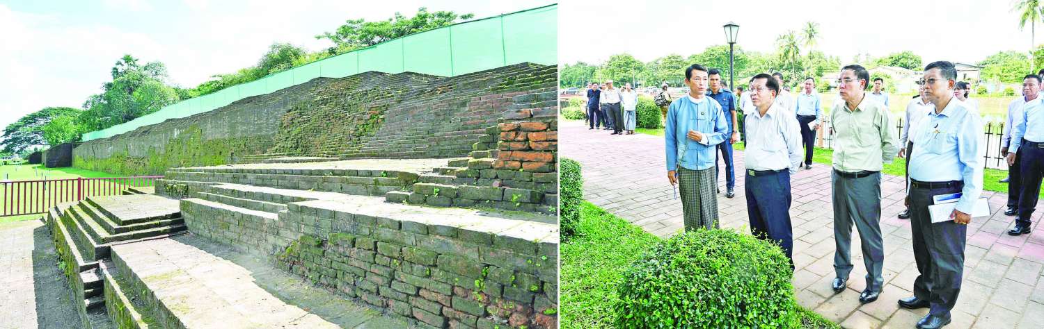 ဆက်လက်၍ ဟံသာဝတီမြို့ရိုး၊ ကျုံးဘေးတစ်လျှောက်နှင့် ပဲခူးမြို့အတွင်း မော်တော်ယာဉ်များဖြင့် လှည့်လည်ကြည့်ရှုစစ်ဆေးခဲ့ကြပြီး ပဲခူးမြို့အတွင်း ဖြတ်သန်းစီးဆင်းသွားသည့် ပဲခူးမြစ်အား ကျောက်စီနံရံများပြုလုပ်၍ ရေစီးဆင်းမှုများကောင်းမွန်စေရေး စနစ်တကျဖြင့် ထိန်းသိမ်းဆောင်ရွက်ရန် တာဝန်ရှိသူများကို လမ်းညွှန်မှာကြားခဲ့သည်။