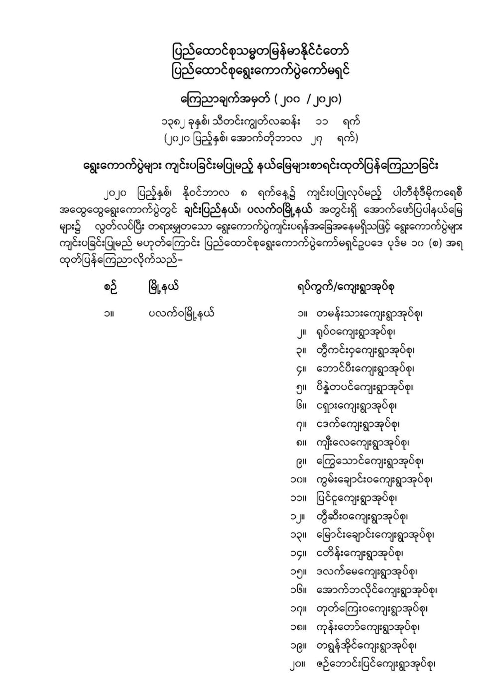 ရွေးကောက်ပွဲများ ကျင်းပခြင်းမပြုမည့် နယ်မြေများစာရင်း ထုတ်ပြန်ကြေညာခြင်း 10/27/2020 ရွေးကောက်ပွဲများ ကျင်းပခြင်းမပြုမည့် နယ်မြေများစာရင်း ထုတ်ပြန်ကြေညာခြင်း