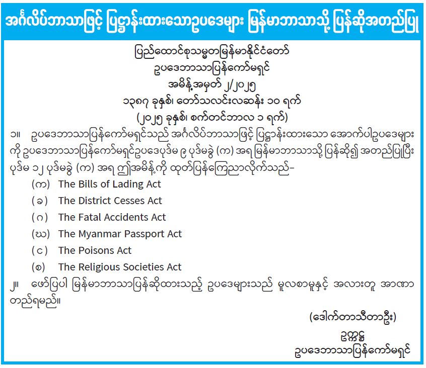 အင်္ဂလိပ်ဘာသာဖြင့် ပြဋ္ဌာန်းထားသောဥပဒေများ မြန်မာဘာသာသို့ ပြန်ဆိုအတည်ပြု