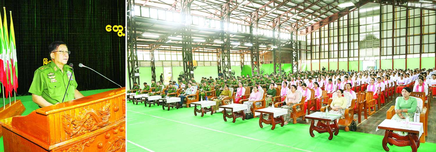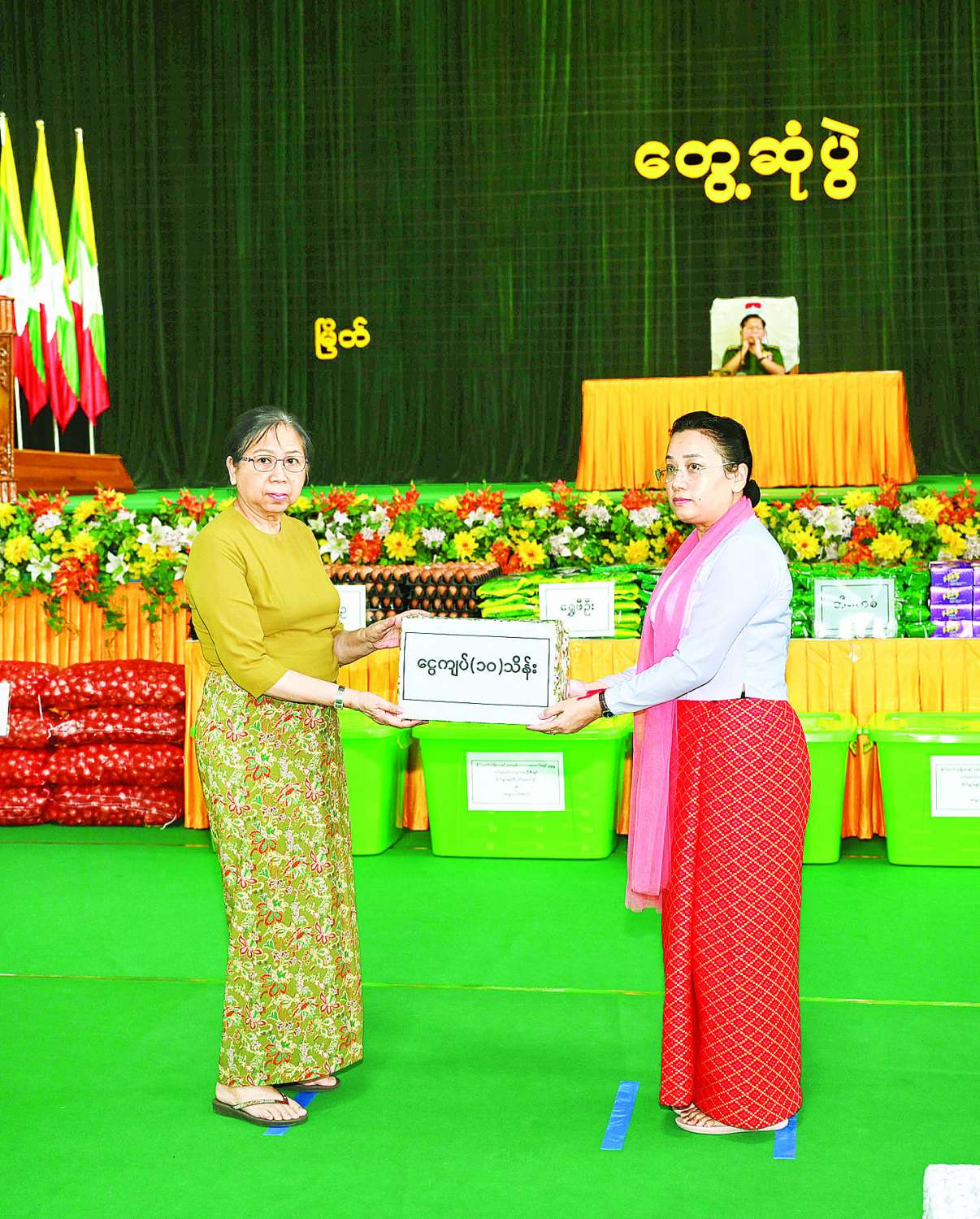 ထို့နောက် နိုင်ငံတော်လုံခြုံရေးနှင့်အေးချမ်းသာယာရေးကော်မရှင်ဥက္ကဋ္ဌ တပ်မတော်ကာကွယ်ရေးဦးစီးချုပ်က တပ်နယ်မှ အရာရှိ၊ စစ်သည်၊ မိသားစုများအတွက် စားသောက်ဖွယ်ရာပစ္စည်းများကို ပေးအပ်ရာ တိုင်းမှူးကလည်းကောင်း၊ နိုင်ငံတော်လုံခြုံရေးနှင့် တပ်မတော်အေးချမ်းသာယာရေးကော်မရှင်ဥက္ကဋ္ဌ ကာကွယ်ရေးဦးစီးချုပ်၏ ဇနီးက တပ်နယ်မိခင်နှင့် ကလေးစောင့်ရှောက်ရေးအသင်းအတွက် ချီးမြှင့်ငွေများကို ပေးအပ်ရာ တိုင်းမှူး၏ ဇနီးကလည်းကောင်း အသီးသီးလက်ခံရယူကြသည်။