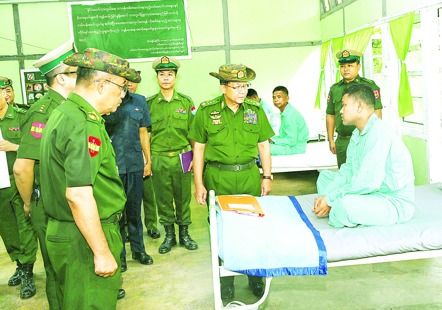 ယင်းနောက် နိုင်ငံတော်လုံခြုံရေးနှင့်အေးချမ်းသာယာရေးကော်မရှင်ဥက္ကဋ္ဌ တပ်မတော်ကာကွယ်ရေးဦးစီးချုပ်သည် တပ်နယ်ရှိ နယ်မြေခံတပ်မတော်ဆေးရုံတွင် တက်ရောက်ကုသလျက်ရှိသည့် နိုင်ငံတော်ကာကွယ်ရေးနှင့်လုံခြုံရေးတာဝန်များ ထမ်းဆောင်စဉ် ထိခိုက်ဒဏ်ရာရရှိခဲ့သော အရာရှိ၊ စစ်သည်များအား ထိခိုက်ဒဏ်ရာရရှိခဲ့မှုအခြေအနေများ၊ ရောဂါကုသပျောက်ကင်းမှုအခြေအနေများကို တစ်ဦးချင်းလိုက်လံတွေ့ဆုံ၍ ရင်းနှီးနွေးထွေးစွာမေးမြန်းပြီး အားပေးစကားပြောကြားကာ အရာရှိ၊ စစ်သည်များ၏ တင်ပြချက်များအပေါ် လိုအပ်သည်များ ဖြည့်ဆည်းဆောင်ရွက်ပေးသည်။