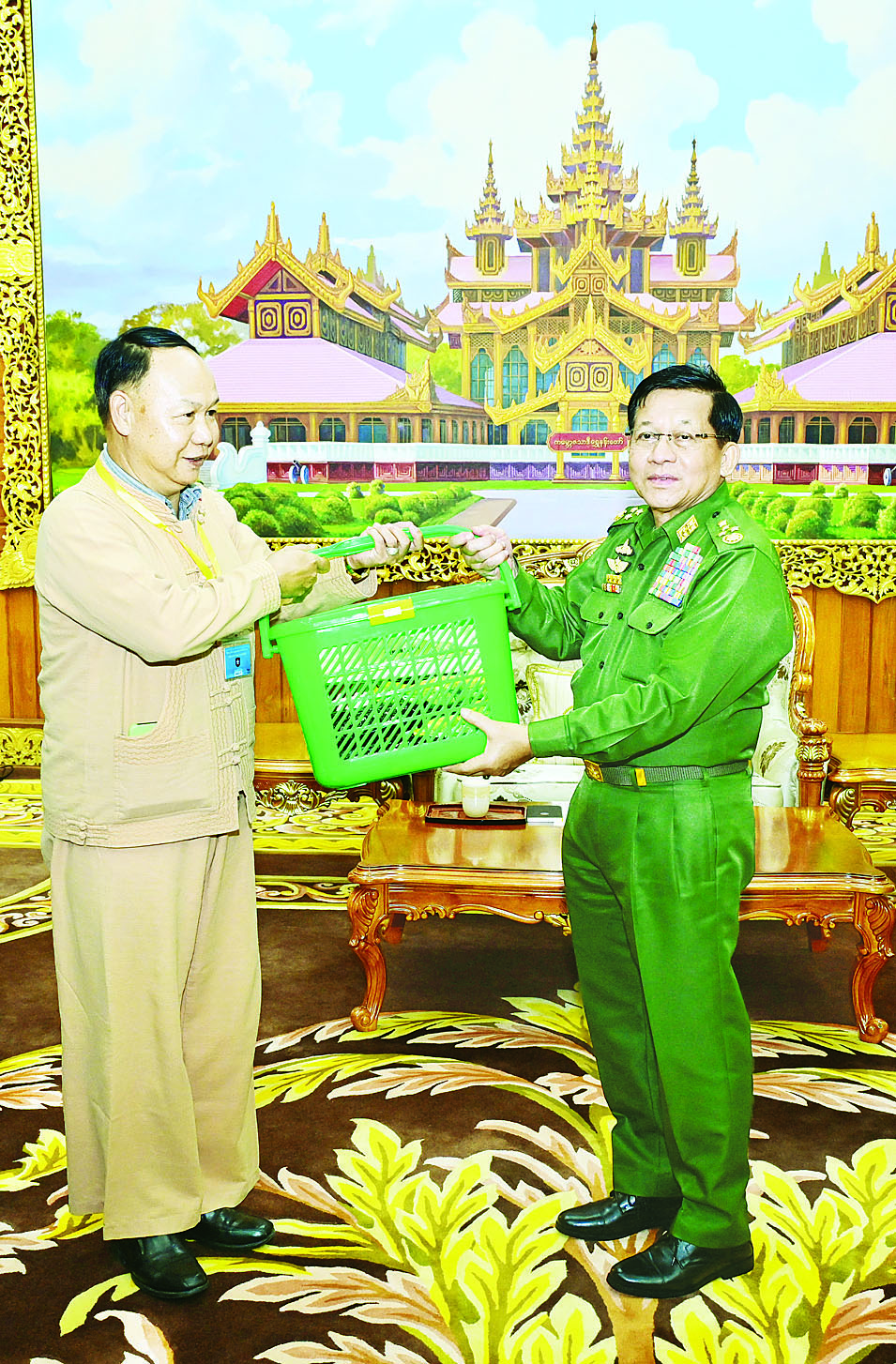 နိုင်ငံတော်လုံခြုံရေးနှင့် အေးချမ်းသာယာရေးကော်မရှင်ဥက္ကဋ္ဌ တပ်မတော်ကာကွယ်ရေးဦးစီးချုပ် ဗိုလ်ချုပ်မှူးကြီး မင်းအောင်လှိုင်ထံသို့ ငြိမ်းချမ်းရေးဆွေးနွေးပွဲသို့ တက်ရောက်ခဲ့သည့် တိုင်းရင်းသားလက်နက်ကိုင်ကိုယ်စားလှယ်အဖွဲ့များက ယနေ့နံနက်ပိုင်းတွင် နေပြည်တော်ရှိ ဘုရင့်နောင်ရိပ်သာဧည့်ခန်းမ၌ လာရောက်ဂါရဝပြုတွေ့ဆုံသည်။