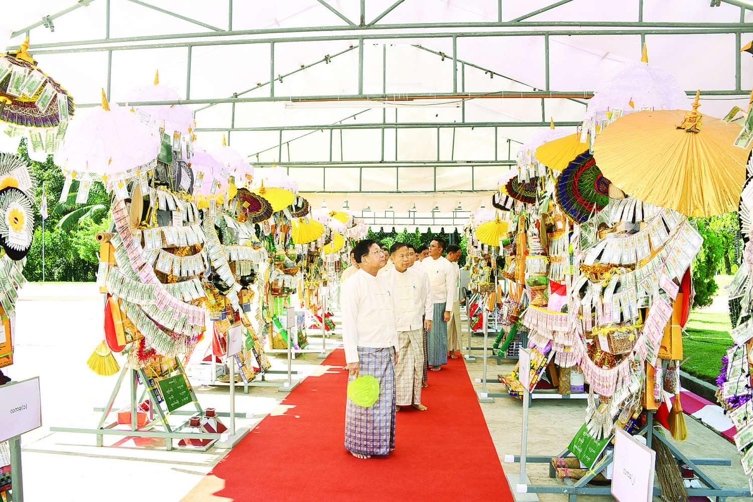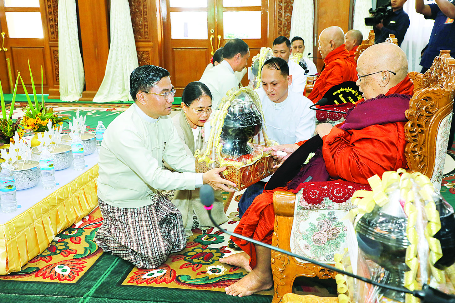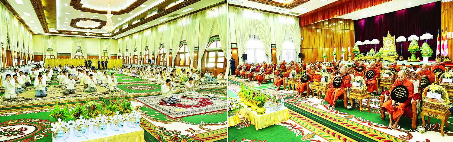 ဦးစွာ နိုင်ငံတော်လုံခြုံရေးနှင့်အေးချမ်းသာယာရေးကော်မရှင်ဥက္ကဋ္ဌ တပ်မတော်ကာကွယ်ရေးဦးစီးချုပ်နှင့်ဇနီး၊ ဧည့်ပရိသတ်များသည် ဘုန်းတော်ကြီးကျောင်းအသီးသီးသို့ လှူဒါန်းရန် ခင်းကျင်းပြင်ဆင်ထားသည့် ကထိန်လျာသင်္ကန်း၊ လှူဖွယ်ပစ္စည်းများနှင့် ပဒေသာပင်များအား လှည့်လည်ကြည့်ရှုကြသည်။ ထို့နောက် နိုင်ငံတော်လုံခြုံရေးနှင့် အေးချမ်းသာယာရေးကော်မရှင်ဥက္ကဋ္ဌ တပ်မတော်ကာကွယ်ရေးဦးစီးချုပ်သည် အနော်ရထာခန်းမအတွင်းရှိ ဗုဒ္ဓရုပ်ပွားတော်မြတ်အား ဖူးမြော်ကြည်ညို၍ မြသပိတ်ဆွမ်းတော်နှင့် ပန်း၊ သောက်တော်ရေချမ်း၊ ဆီမီး၊ သစ်သီးတို့ကို ဆက်ကပ်လှူဒါန်းသည်။