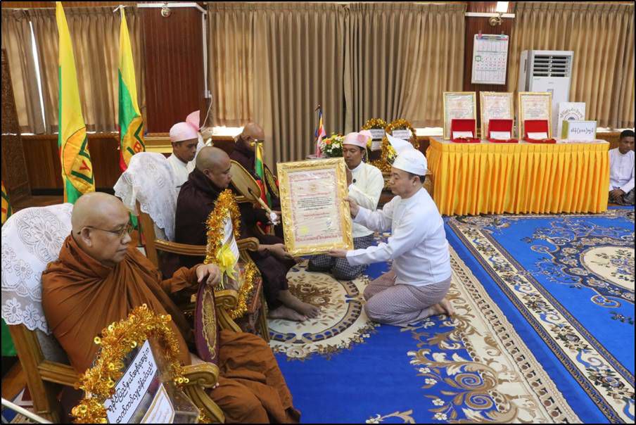 ယင်းနောက် ဗုဒ္ဓဘာသာကလျာဏယုဝအသင်းကြီး(YMBA) (ဗဟို) ဥက္ကဋ္ဌ ဦးရဲထွန်းက ပြည်နယ်ဝန်ကြီးချုပ် ဦးထိန်လင်းအား မဟာမင်္ဂလဓမ္မဇောတိကဓဇ ဘွဲ့တံဆိပ်တော်ကို လည်းကောင်း၊ ပြည်နယ်ဝန်ကြီးချုပ်က ရက္ခိတစွမ်းအားပရဟိတအသင်းဥက္ကဋ္ဌ ဦးဝင်းမောင်မောင်အား မင်္ဂလဓမ္မဇောတိကဓဇဘွဲ့တံဆိပ်တော်ကိုလည်းကောင်း၊ တိုင်းမှူးက ပြည်နယ်ဗုဒ္ဓဘာသာကလျာဏယုဝအသင်းအတွင်းရေးမှူး ဦးမောင်သိန်းခိုင်အား မင်္ဂလဓမ္မဇောတိကဓဇဘွဲ့တံဆိပ်တော်ကိုလည်းကောင်း အသီးသီးချီးမြှင့်အပ်နှင်းပေးအပ်သည်။