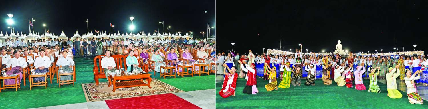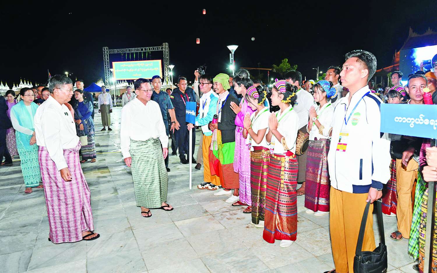 ဦးစွာ နိုင်ငံတော်ယာယီသမ္မတ နိုင်ငံတော်လုံခြုံရေးနှင့်အေးချမ်းသာယာရေးကော်မရှင်ဥက္ကဋ္ဌနှင့် ဇနီးတို့သည် အခမ်းအနားကျင်းပမည့်နေရာသို့ ရောက်ရှိကြရာ မြန်မာ့အသံနှင့်ရုပ်မြင်သံကြားမှ တိုင်းရင်းသား၊ တိုင်းရင်းသူများ၊ သာသနာရေးနှင့်ယဉ်ကျေးမှုဝန်ကြီးဌာန အနုပညာဦးစီးဌာနမှ ယဉ်ကျေးမှုအဖွဲ့များ၊ အနုပညာရှင်များက မြန်မာ့ရိုးရာ မီးပုံးငယ်များကို ကိုင်ဆောင်၍ လှိုက်လှဲနွေးထွေးစွာ ကြိုဆိုကြသည်။