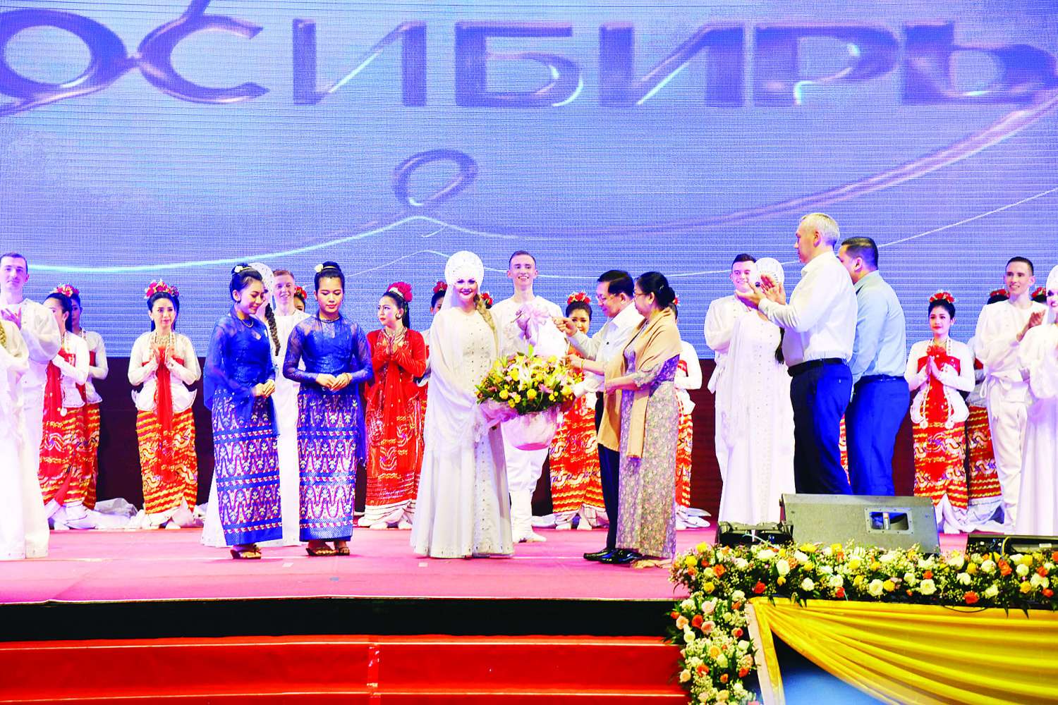 ရုရှားဖက်ဒရေးရှင်းနိုင်ငံ နိုဗိုစီဗစ်ဒေသမှ နိုဗိုစီဗစ် “Chaldony” State Song and Dance Ensemble အဖွဲ့မှ “မဟာရုရှားနှင့် ဆိုက်ဘေးရီးယား” အမည်ရသည့် ပဒေသာကပွဲကို ယနေ့မွန်းလွဲပိုင်းတွင် နေပြည်တော်ရှိ မြန်မာအပြည်ပြည်ဆိုင်ရာကွန်ဗင်းရှင်းဗဟိုဌာန (၁) (MICC-1) ၌ ကျင်းပပြုလုပ်ရာ ပြည်ထောင်စုသမ္မတမြန်မာနိုင်ငံတော်ယာယီသမ္မတ နိုင်ငံတော်လုံခြုံရေးနှင့်အေးချမ်းသာယာရေးကော်မရှင်ဥက္ကဋ္ဌ ဗိုလ်ချုပ်မှူးကြီး မင်းအောင်လှိုင် တက်ရောက်ကြည့်ရှုအားပေးသည်။
