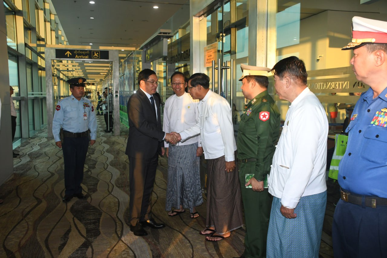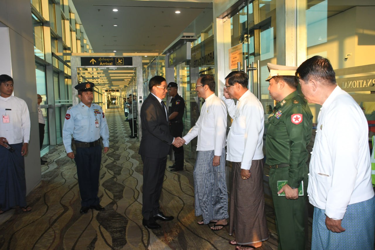 နိုင်ငံတော်ဝန်ကြီးချုပ်နှင့်အဖွဲ့အား ကျန်းမာရေးဝန်ကြီးဌာန ပြည်ထောင်စုဝန်ကြီး ဒေါက်တာ သက်ခိုင်ဝင်း၊ ရန်ကုန်တိုင်းဒေသကြီးဝန်ကြီးချုပ် ဦးစိုးသိန်း၊ ရန်ကုန်တိုင်းစစ်ဌာနချုပ် တိုင်းမှူး ဗိုလ်ချုပ်ပြည့်စုံလင်းနှင့် တိုင်းဒေသကြီးအစိုးရအဖွဲ့မှ တာဝန်ရှိသူများက ရန်ကုန်အပြည်ပြည်ဆိုင်ရာလေဆိပ်၌ ကြိုဆိုနှုတ်ဆက်ခဲ့ကြကြောင်း သတင်းရရှိသည်။
