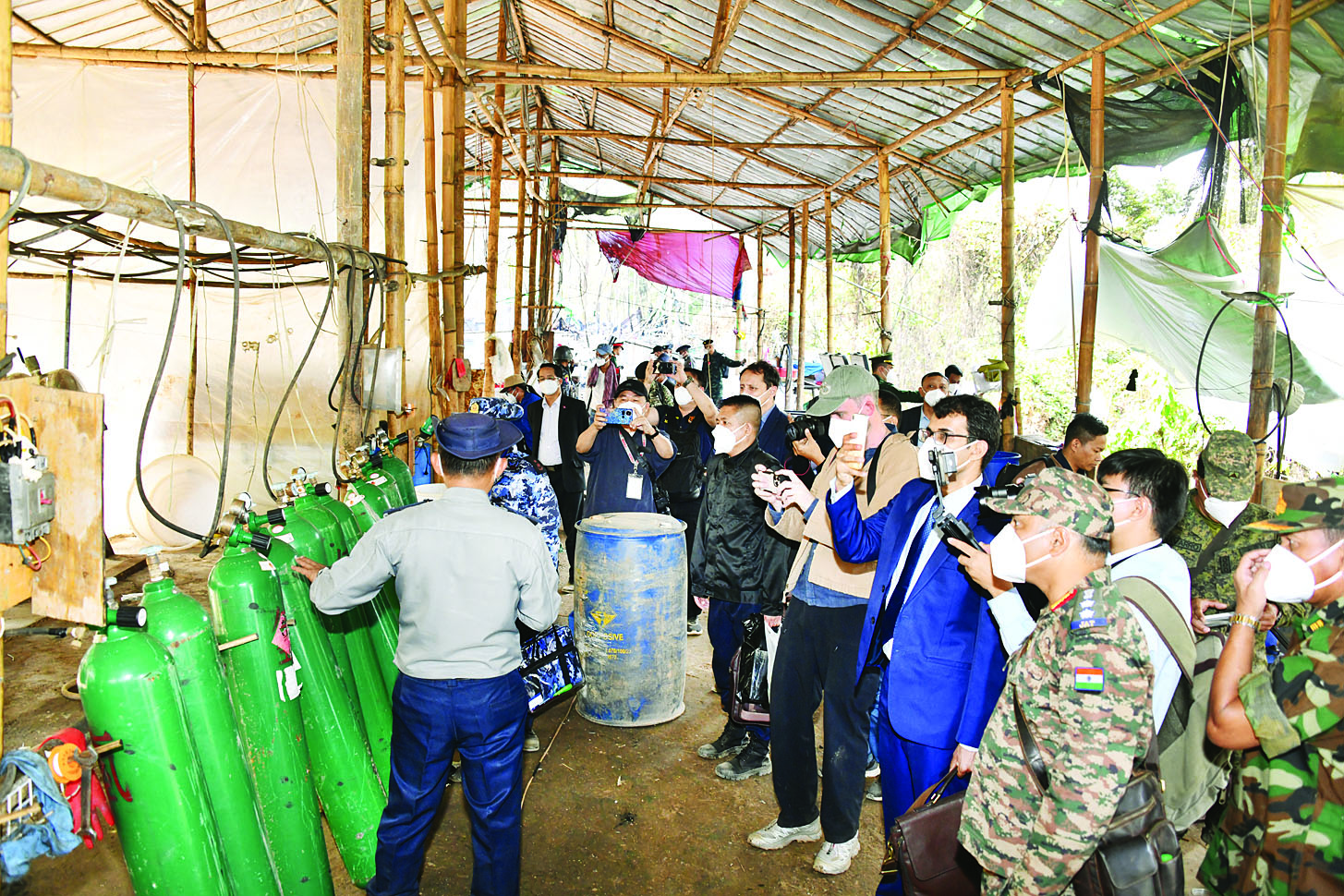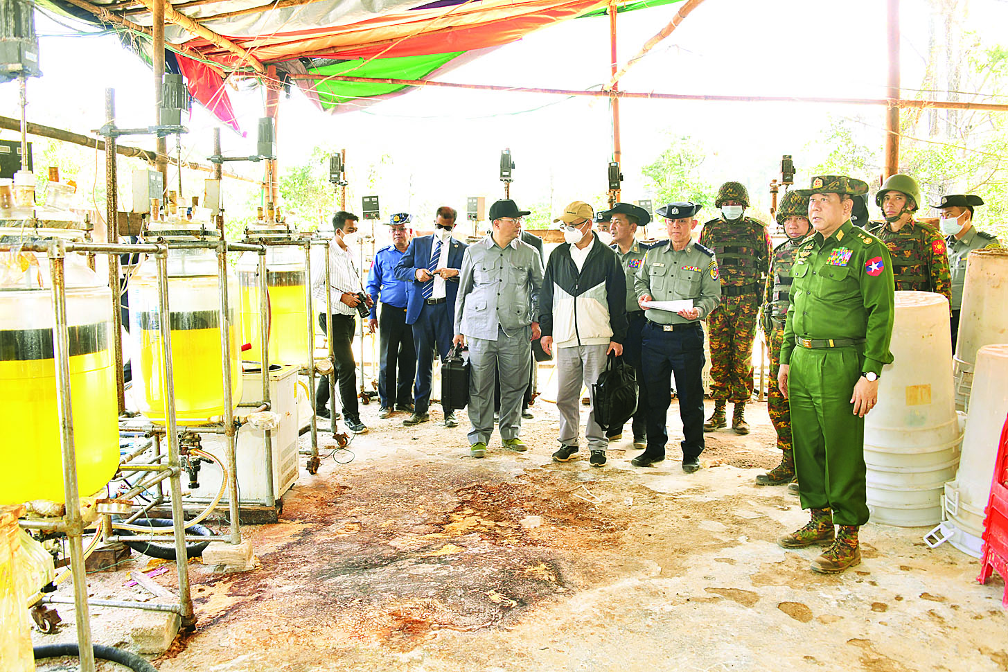 ဆက်လက်၍ ကော်မရှင်အဖွဲ့ဝင် ပြည်ထဲရေးဝန်ကြီးဌာန ပြည်ထောင်စုဝန်ကြီး၊ အမျိုးသားကာကွယ်ရေးနှင့်လုံခြုံရေးကောင်စီ သတင်းထုတ်ပြန်ရေးအဖွဲ့ အဖွဲ့ခေါင်းဆောင် ပြန်ကြားရေးဝန်ကြီးဌာန ဒုတိယဝန်ကြီးနှင့် တာဝန်ရှိသူများ၊ သံတမန်များ၊ သတင်းမီဒီယာအဖွဲ့များသည် ယင်းနေရာ၏ အနောက်တောင်ဘက် ၁၉ ကီလိုမီတာခန့်အကွာ၌ မူးယစ်ဆေးဝါးအဓိကချက်လုပ်သည့်နေရာသို့ ရောက်ရှိကြရာ ဆေးဝါးချက်လုပ်ရာတွင်အသုံးပြုသော ဓာတုပစ္စည်းများ၊ ဆက်စပ်ပစ္စည်းများနှင့်ပတ်သက်၍ မြန်မာနိုင်ငံ၊ မူးယစ်ဆေးဝါးတားဆီးနှိမ်နင်းရေးရဲတပ်ဖွဲ့ တပ်ဖွဲ့မှူး ရဲမှူးချုပ် သန့်လွင်မောင်နှင့် တာဝန်ရှိသူများက ရှင်းလင်းပြောကြားပြီး သိရှိလိုသည့်မေးမြန်းမှုများကို ပြန်လည်ဖြေကြားသည်။