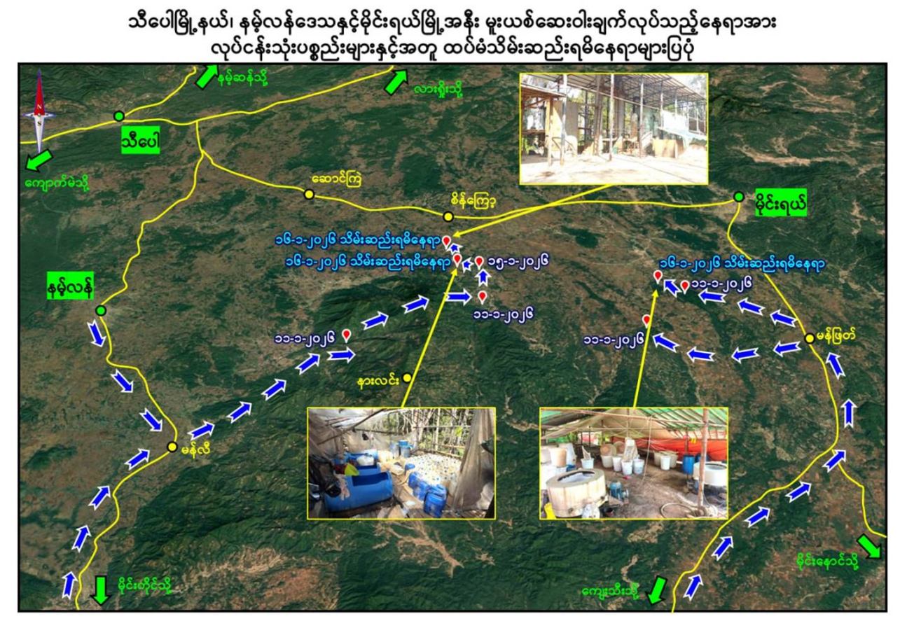 အလားတူ နံနက် ၁၁ နာရီ ၄၅ မိနစ်ခန့်တွင် ယမန်နေ့က ဖမ်းဆီးရမိခဲ့သည့်နေရာ၏ အနောက်မြောက်ဘက် ၂ ကီလိုမီတာခန့်အကွာ ၊ သီပေါ - မိုင်းရယ်သွားကားလမ်းအနီးရှိ စိန်ကြော့ကျေးရွာ၏ အရှေ့တောင်ဘက် ၁၅ ကီလိုမီတာခန့်အကွာတွင် မသင်္ကာဖွယ်ရာ အဆောက်အအုံများတွေ့ရှိရသဖြင့် သွားရောက်ရှင်းလင်းခြင်းဆောင်ရွက်ခဲ့ရာ မူးယစ်ဆေးဝါးချက်လုပ်ရာတွင် အသုံးပြုသည့် လူ ၅ ဦးဆန့် လူနေတဲ ၃၅ လုံး၊ Lovon အမျိုးအစား ဘက်ဟိုး ၁ စီး၊ အလျား ၃၀ ပေ၊ အနံ ၁၅ ပေရှိ ဝါးဂိုဒေါင် ၂ လုံး၊ အက်ဆစ် ၁၅ ဂါလံပုံး ၇၀ လုံး၊ အရှည်ပေ ၃၀၀ ခန့်ရှိ တဲ ၁ လုံး၊ အခြောက်ခံဗန်း ၃ ချပ်၊ မူးယစ်ဆေးဝါးချက်လုပ်သည့် ဖို ၃ ခု၊ ဂက်စ်အိုး ၁၅၀ လုံး၊ ကျောက်ချဉ်အိတ် ၁၅၀ လုံး၊ ဆာလဖြူရစ် အက်ဆစ်ထည့်သောပုံးပြာ (အရည်ပါ) ၅၀၀ လုံး၊ ပုံးပြာအခွံ ၁၀၀၀ လုံး၊ ဆာလာအိတ်များဖြင့်ထည့်ထားသည့် Caustic Soda ၁၅၀ အိတ်၊ ဆပ်ပြာခွက်များထည့်ထားသည့် ကတ်ထူဖာ ၃၀၀ ဖာ တို့ကို ရှာဖွေဖော်ထုတ်သိမ်းဆည်းနိုင်ခဲ့ပြီး ထပ်မံ၍ရှာဖွေစစ်ဆေးခြင်းများ ဆောင်ရွက်ခဲ့ရာ မွန်းလွဲ ၁ နာရီခန့်တွင် အဆိုပါနေရာ၏ အနောက်မြောက်ဘက် ၄ ကီလိုမီတာခန့်အကွာ၌ မူးယစ်ဆေးဝါးချက်လုပ်ရာတွင် အသုံးပြုသည့် ဘွိုင်လာအိုး ၂ လုံးပါ အလျား ၉၀ ပေ၊ အနံ ၄၀ ပေရှိ အဆောက်အအုံ ၁ လုံး၊ ရေထည့် Boxer ကန် ၂ လုံး၊ Liugong အမျိုးအစား Loader ၁ စီးနှင့် အလျား ၄၀ ပေ၊ အနံ ၂၀ ပေရှိ လူနေတဲ ၃ လုံးတို့ကို ထပ်မံတွေ့ရှိသိမ်းဆည်းရမိခဲ့သည်။