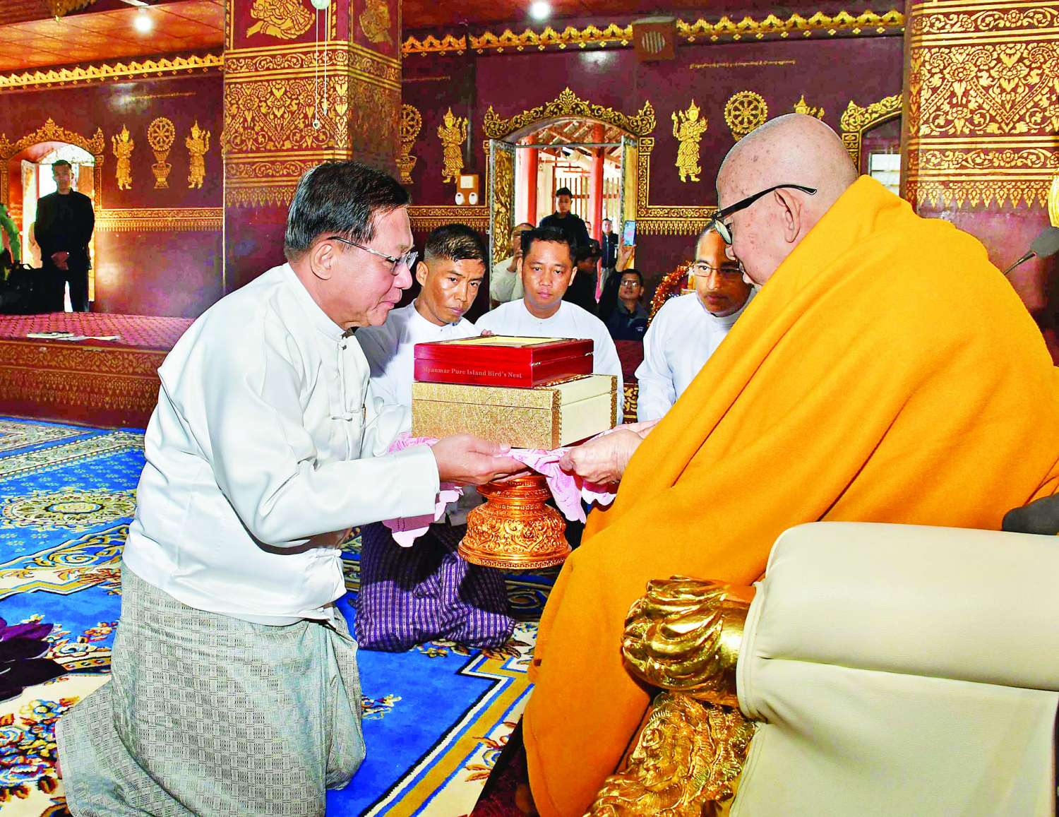 ယင်းနောက် နိုင်ငံတော်ယာယီသမ္မတ နိုင်ငံတော်လုံခြုံရေးနှင့် အေးချမ်းသာယာရေးကော်မရှင်ဥက္ကဋ္ဌက ကျိုင်းယင်းကျောင်းတိုက် ဦးစီးပဓာနနာယက၊ အဂ္ဂမဟာသဒ္ဓမ္မဇောတိကဓဇ ဘဒ္ဒန္တခေမာစာရ သက်တော်ရှည်မဟာထေရ်မြတ်ကြီးထံ “စည်သူဘွဲ့”တံဆိပ်တော်နှင့် အဆောင်အယောင်များ၊ လှူဖွယ်ပစ္စည်းများ၊ နဝကမ္မအလှူတော်ငွေများကို ဆက်ကပ်လှူဒါန်းသည်။ ၎င်းနောက် ဆရာတော်ကြီးက နိုင်ငံတော်ယာယီသမ္မတ နိုင်ငံတော်လုံခြုံရေးနှင့် အေးချမ်းသာယာရေးကော်မရှင်ဥက္ကဋ္ဌထံ ဓမ္မလက်ဆောင်ပြန်လည်ပေးအပ်သည်။