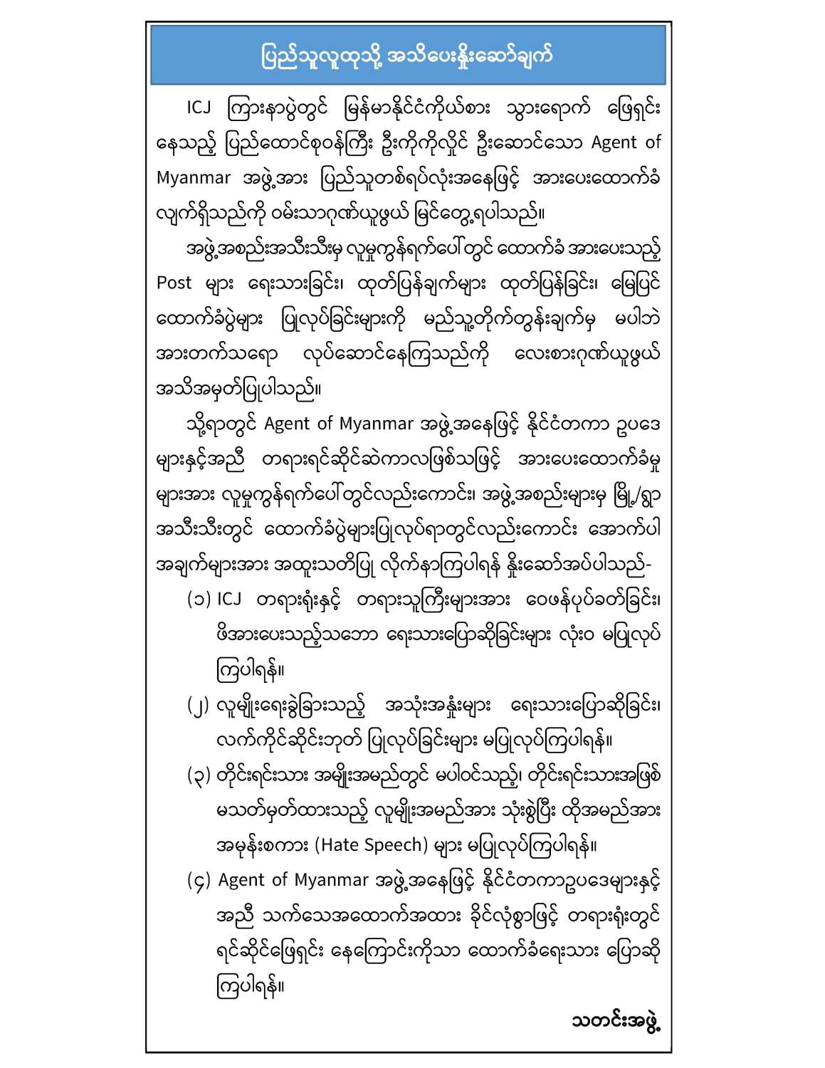 (၄) Agent of Myanmar အဖွဲ့အနေဖြင့် နိုင်ငံတကာဥပဒေများနှင့်အညီ သက်သေအထောက်အထား ခိုင်လုံစွာဖြင့် တရားရုံးတွင် ရင်ဆိုင်ဖြေရှင်းနေကြောင်းကိုသာ ထောက်ခံရေးသားပြောဆိုကြပါရန်။