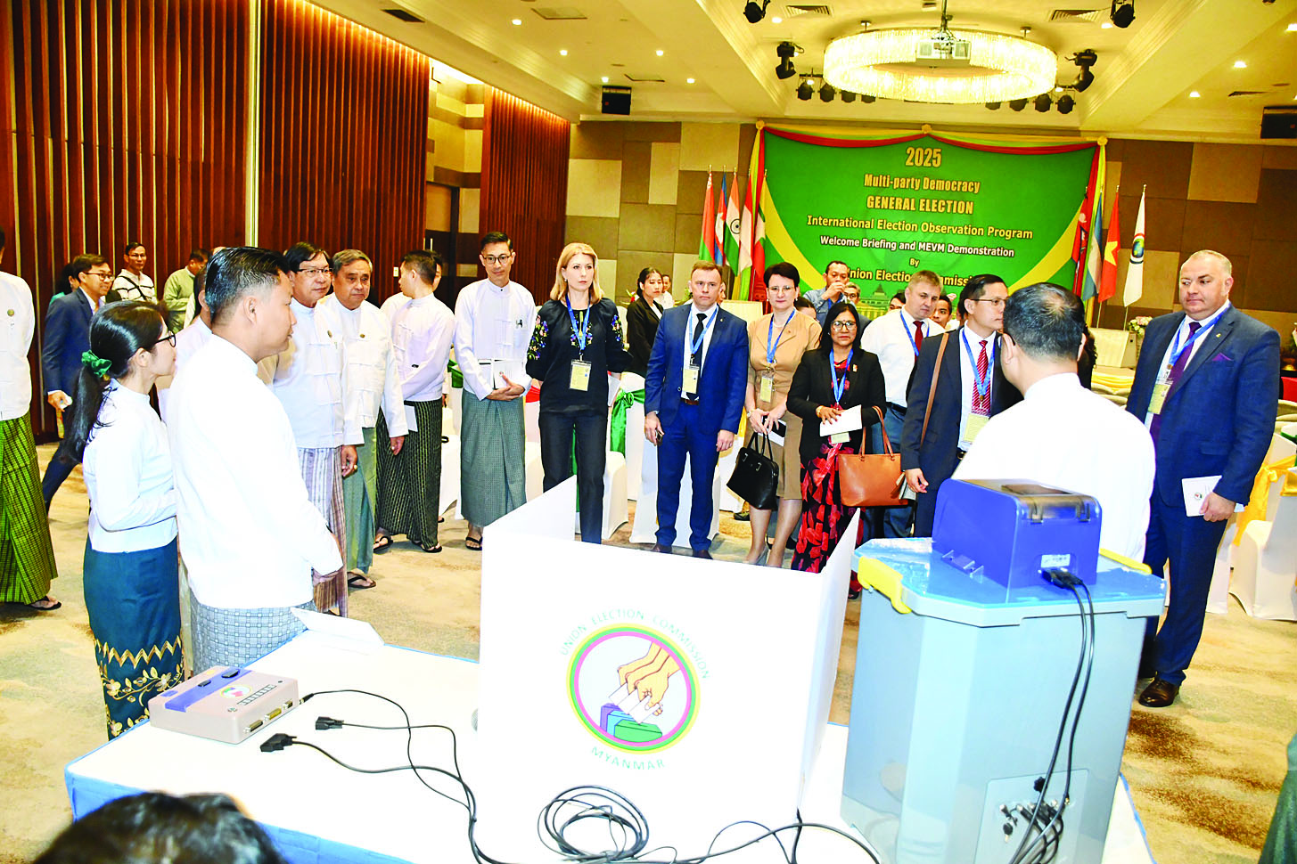 ထို့နောက် ပြည်ထောင်စုရွေးကောက်ပွဲကော်မရှင်ရုံးမှ တာဝန်ရှိသူများက မြန်မာအီလက်ထရောနစ်မဲပေးစက် (MEVM) အသုံးပြုပုံကို လက်တွေ့ရှင်းလင်းပြသကြပြီး နိုင်ငံတကာရွေးကောက်ပွဲ စောင့်ကြည့်လေ့လာရေးအဖွဲ့များက မဲပေးစက်နှင့်စပ်လျဉ်း၍ သိရှိလိုသည်များကို မေးမြန်းဆွေးနွေးကြရာ ကော်မရှင်ရုံးမှ တာဝန်ရှိသူများက ရှင်းလင်းဖြေကြား၍ အခမ်းအနားကိုရုပ်သိမ်းလိုက်သည်။