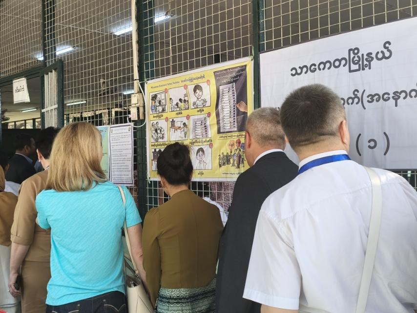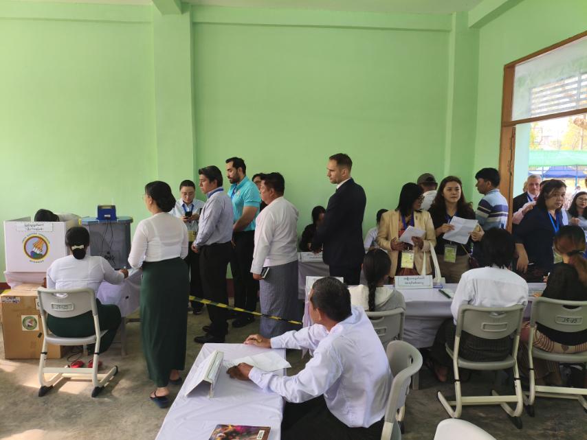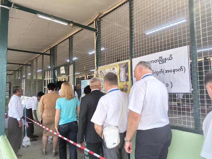 နိုင်ငံတကာရွေးကောက်ပွဲစောင့်ကြည့်လေ့လာရေးအဖွဲ့များဖြစ်သည့် ဘယ်လာရုစ်သမ္မတနိုင်ငံမှကိုယ်စားလှယ်အဖွဲ့၊ ကမ္ဘောဒီးယားနိုင်ငံရွေးကောက်ပွဲကော်မရှင်မှ ကိုယ်စားလှယ်အဖွဲ့၊ နီပေါနိုင်ငံရွေးကောက်ပွဲကော်မရှင်မှကိုယ်စားလှယ်အဖွဲ့၊ အင်ဒိုနီးရှားနိုင်ငံရွေးကောက်ပွဲကော်မရှင်မှကိုယ်စားလှယ်အဖွဲ့၊ ဗီယက်နမ်ဆိုရှယ်လစ်သမ္မတနိုင်ငံမှ ကိုယ်စားလှယ်အဖွဲ့၊ နီကာရာဂွါနိုင်ငံမှ ကိုယ်စားလှယ်အဖွဲ့၊ အိန္ဒိယနိုင်ငံမှကိုယ်စားလှယ်နှင့် International Conference of Asian Political Parties (ICAPP) အဖွဲ့မှကိုယ်စားလှယ်အဖွဲ့များသည် ရန်ကုန်တိုင်းဒေသကြီးရွေးကောက်ပွဲကော်မရှင်အဖွဲ့ခွဲမှတာဝန်ရှိသူများ၊ ပြည်ထောင်စုရွေးကောက်ပွဲကော်မရှင်ရုံးမှ တာဝန်ရှိသူများနှင့်အတူ သာကေတမြို့နယ် အမှတ်(၇)ရပ်ကွက်(အနောက်)ရှိ မဲရုံအမှတ်(၁)၊ မဲရုံအမှတ်(၂)နှင့် မဲရုံအမှတ်(၃)များသို့ရောက်ရှိပြီး မဲဆန္ဒရှင်ပြည်သူများ လွတ်လပ်စွာဆန္ဒမဲပေးနေမှု၊ မဲရုံတာဝန်ရှိသူများမှ ပြည်သူများအစဥ်ပြေစွာ ဆန္ဒမဲပေးနိုင်ရေးကူညီဆောင်ရွက်ပေးနေမှုများကို လေ့လာကြည့်ရှုသည်။ ဆက်လက်၍ မဲရုံတာဝန်ထမ်းဆောင်ကြသူများနှင့် လွတ်လပ်စွာဆန္ဒမဲလာရောက်ပေးလျက်ရှိသော ပြည်သူများအား ရင်းရင်းနှီးနှီးတွေ့ဆုံနှုတ်ဆက်၍ သိရှိလိုသည်များကို ဆွေးနွေးမေးမြန်းခဲ့ကြကြောင်း သိရှိရသည်။