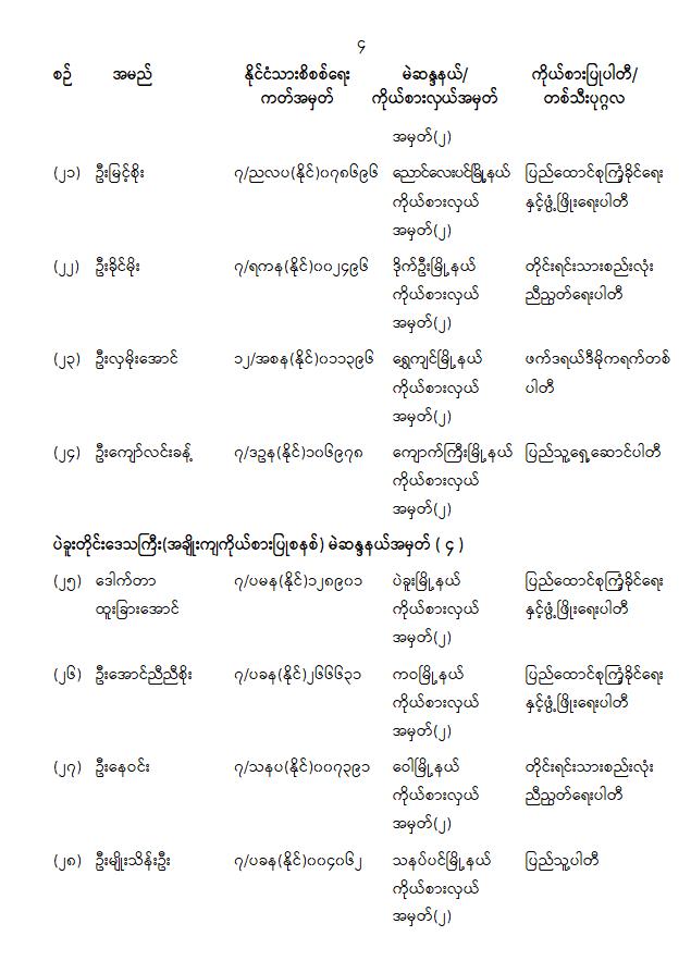 တိုင်းဒေသကြီးလွှတ်တော် သို့မဟုတ် ပြည်နယ်လွှတ်တော်ကိုယ်စားလှယ်အဖြစ် ရွေးကောက်တင်မြှောက်ခံရသူများ အမည်စာရင်းကြေညာခြင်း 01/31/2026 တိုင်းဒေသကြီးလွှတ်တော် သို့မဟုတ် ပြည်နယ်လွှတ်တော်ကိုယ်စားလှယ်အဖြစ် ရွေးကောက်တင်မြှောက်ခံရသူများ အမည်စာရင်းကြေညာခြင်း
