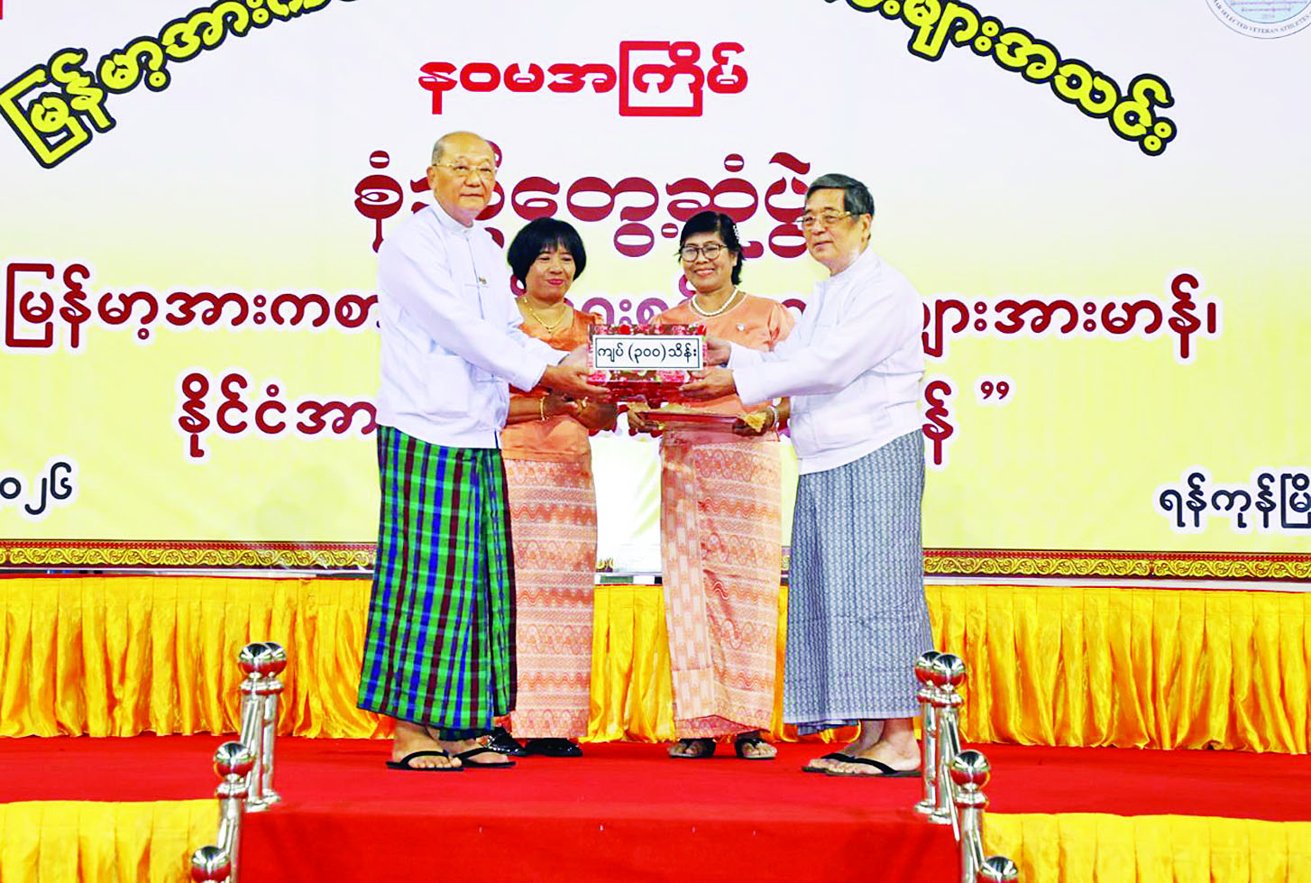ယင်းနောက် ယဉ်ကျေးမှုဝန်ကြီးဌာန ပြည်ထောင်စုဝန်ကြီး (ငြိမ်း) ဦးအေးမြင့်ကြူနှင့် ရန်ကုန်တိုင်းဒေသကြီး လူမှုရေးရာဝန်ကြီး ဦးဌေးအောင်၊ မြန်မာ့အားကစားလက်ရွေးစင်ဟောင်းများအသင်းဥက္ကဋ္ဌ မြန်မာ့ဘောလုံးလက်ရွေးစင်ဟောင်း ဦးအေးမောင်ကြီးတို့က ကြိုဆိုနှုတ်ခွန်းဆက်စကားပြောကြားကြပြီး မြန်မာ့အားကစားလက်ရွေးစင်ဟောင်းများအသင်းသို့ မြန်မာနိုင်ငံအိုလံပစ်ကော်မတီက လှူဒါန်းသည့် ငွေကျပ်သိန်း ၃၀၀၊ ရန်ကုန်တိုင်းဒေသကြီးအစိုးရအဖွဲ့မှ လှူဒါန်းသည့် ငွေကျပ် သိန်း ၂၀၀၊ အားကစားနှင့်လူငယ်ရေးရာဝန်ကြီးဌာနမှ လှူဒါန်းသည့် ငွေကျပ် ၁၀ သိန်း၊ အားကစားဝတ်စုံ Sport Shirt အထည် ၂၅၀ နှင့် အနွေးဝတ်စုံ Track Suit ၂၅ စုံ၊ ပြည်ထောင်စုဝန်ကြီး (ငြိမ်း) ဦးအေးမြင့်ကြူက လှူဒါန်းသည့် ငွေကျပ် နှစ်သိန်းနှင့် မြန်မာနိုင်ငံအားကစားအဖွဲ့ချုပ်များ၊ မြန်မာ့လက်ရွေးစင်ဟောင်းများ၊ လက်ရွေးစင် အားကစားသမားများ၊ MNL ဘောလုံးအသင်းများမှ လှူဒါန်းသည့် အလှူငွေ စုစုပေါင်း ငွေကျပ် ၉၀၉ သိန်းကို ပြည်ထောင်စုဝန်ကြီးနှင့် တာဝန်ရှိသူများက ပေးအပ်လှူဒါန်းရာ မြန်မာ့အားကစားလက်ရွေးစင်ဟောင်းများအသင်းဥက္ကဋ္ဌနှင့် မြန်မာ့အားကစား လက်ရွေးစင်ဟောင်းများအသင်းနာယကတို့က လက်ခံပြီး အလှူရှင်များကို ဂုဏ်ပြုမှတ်တမ်းလွှာများ ပေးအပ်ကာ ကျေးဇူးတင်စကားပြန်လည်ပြောကြားခဲ့ကြောင်း သတင်းရရှိသည်။