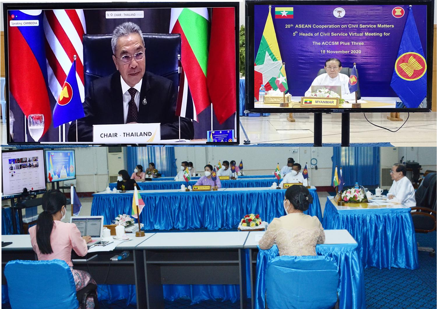 အာဆီယံ နိုင်ငံ့ဝန်ထမ်းဆိုင်ရာ ပူးပေါင်းဆောင်ရွက်ရေးကဏ္ဍ (ASEAN Cooperation on Civil Service Matters-ACCSM) ၏ (၂၀၁၉-၂၀၂၀) အလှည့်ကျ ဥက္ကဋ္ဌအဖြစ် တာဝန်ယူ ဆောင်ရွက်လျက်ရှိသည့် ထိုင်းနိုင်ငံ နိုင်ငံ့ဝန်ထမ်းကော်မရှင်ရုံးက ဦးဆောင်၍ ဗွီဒီယိုကွန်ဖရင့် စနစ်ဖြင့် အကြိမ်(၂၀)မြောက် အာဆီယံ နိုင်ငံ့ဝန်ထမ်း အဖွဲ့အစည်းအကြီးအကဲများ အစည်းအဝေးနှင့် (၅)ကြိမ်မြောက် အာဆီယံ+၃ နိုင်ငံ့ဝန်ထမ်း အဖွဲ့အစည်းအကြီးအကဲများ အစည်း အဝေးများကို ယနေ့တွင် ကျင်းပသည်။