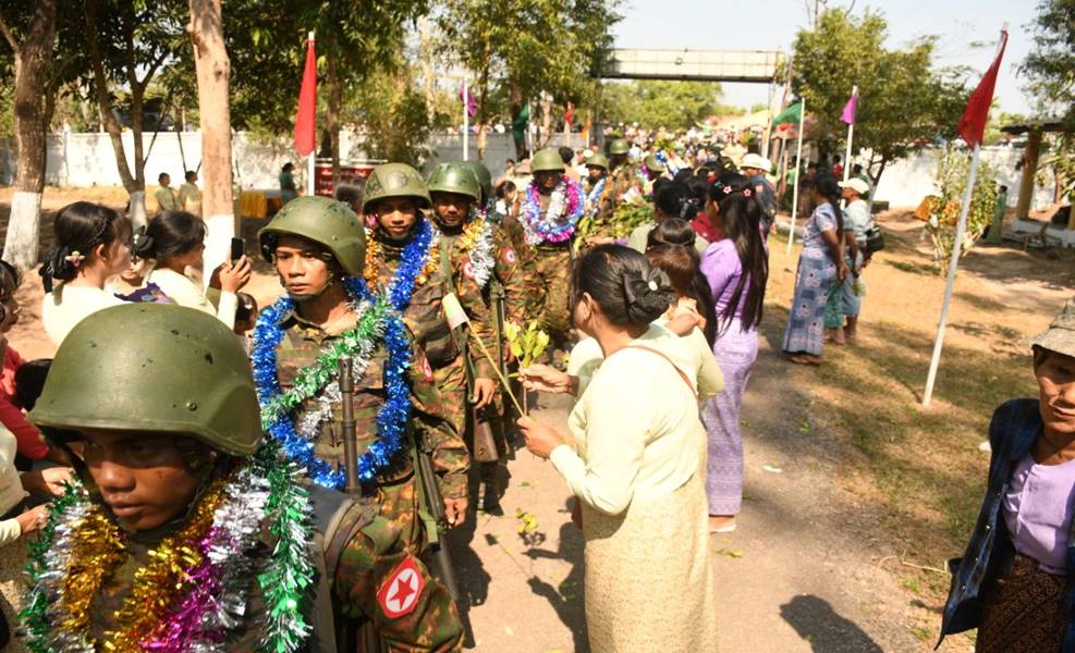 စစ်ဆင်ရေးတာဝန်များကို စွမ်းစွမ်းတမံထမ်းဆောင်ခဲ့ပြီး ရွပ်ရွပ်ချွံချွံတိုက်ပွဲဝင်ခဲ့သော အောင်ပွဲအလီလီရ ရှေ့တန်းပြန်နိုင်ငံ့သားကောင်း တပ်မတော်သားများအား ဝမ်းမြောက်စွာ သောင်းသောင်းဖြဖြ ဂုဏ်ပြုကြိုဆို