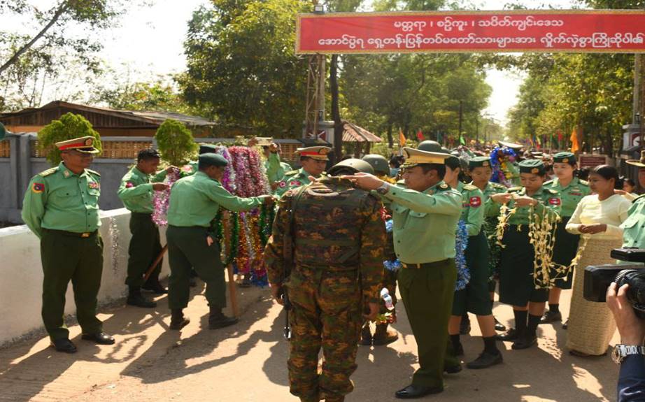 တိုင်းဒေသကြီးနှင့်ပြည်နယ်အသီးသီးရှိ တိုင်းရင်းသားပြည်သူများ စိတ်အေးချမ်းသာစွာ နေထိုင်လုပ်ကိုင်စားသောက်နိုင်ရေးနှင့် အသက်အိုးအိမ်စည်းစိမ်ဥစ္စာ လုံခြုံမှုရှိစေရေး၊ နိုင်ငံတော်တည်ငြိမ်ရေး၊ နယ်မြေအေးချမ်းရေးအတွက် ရှေ့တန်းစစ်မျက်နှာများတွင် စစ်ဆင်ရေးတာဝန်များကို မိဝေးဖဝေး၊ မိသားစုများနှင့်ဝေးကွာ၍ နေ့မအား ညမနား စွမ်းစွမ်းတမံ တာဝန်ထမ်းဆောင်ခဲ့ပြီး ရွပ်ရွပ်ချွံချွံတိုက်ပွဲဝင်၍ အောင်ပွဲအလီလီရယူနိုင်ခဲ့သော အောင်ပွဲရရှေ့တန်းပြန် တပ်မတော်သားများအား တိုင်းမှူးနှင့် တာဝန်ရှိသူများ၊ ဒေသခံပြည်သူများ၊ ကျောင်းသား/ကျောင်းသူများက အောင်သပြေခက်များဖြင့်လည်းကောင်း၊ ဘင်ခရာနှင့်ပန်းပွားအကများ၊ အိုးစည်ဒိုးပတ် အတီး၊ အမှုတ်၊ အက၊ အခုန်များဖြင့်လည်းကောင်း ဝမ်းမြောက်စွာ သောင်းသောင်းဖြဖြ ကြိုဆိုဂုဏ်ပြုခဲ့ကြပြီး တိုင်းမှူးက အောင်ပွဲရ ရှေ့တန်းပြန်တပ်မတော်သားများအား ဂုဏ်ပြုချီးမြှင့်ငွေများ ပေးအပ်ခဲ့ကြောင်း သတင်းရရှိသည်။