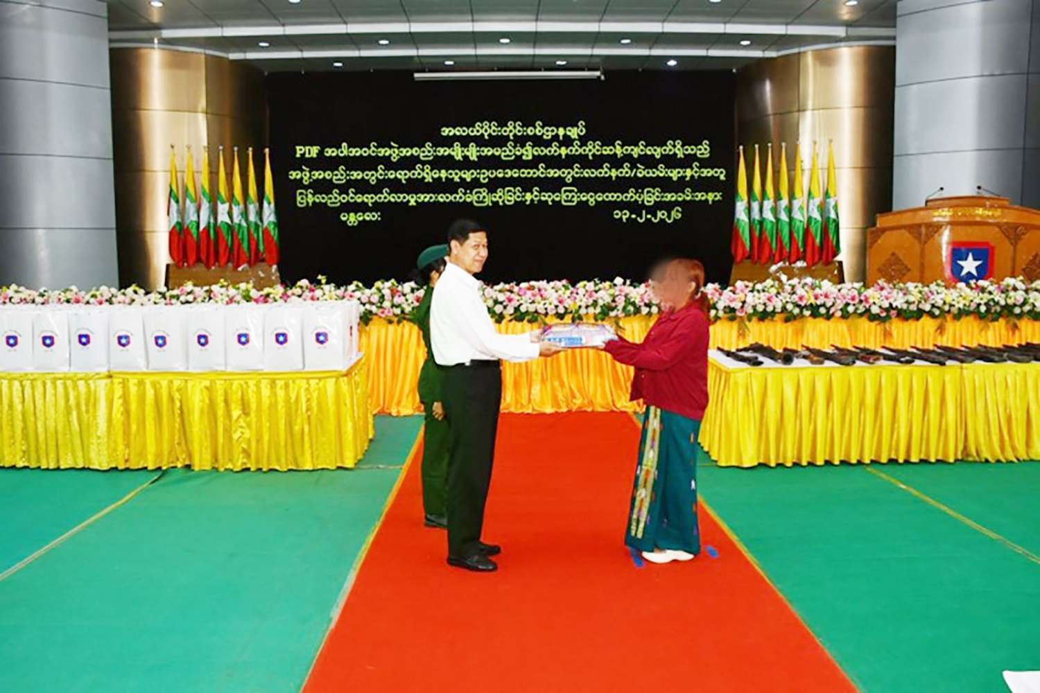 ဦးစွာ တိုင်းဒေသကြီးဝန်ကြီးချုပ်က အဖွင့်အမှာစကားပြောကြားပြီး တိုင်းမှူးက တရားဥပဒေပုဒ်မများနှင့်ပတ်သက်၍ အသိပညာပေးစကားများ ရှင်းလင်းဆွေးနွေးပြောကြားသည်။ ထို့နောက် ဥပဒေဘောင်အတွင်း ပြန်လည်ဝင်ရောက်ခဲ့ကြသူများက ၎င်းတို့နှင့်အတူပါရှိလာသည့် မောင်းပြန်ရိုင်ဖယ် ၁၅ လက်၊ RPG ၁ လက်၊ လက်လုပ်သေနတ်၂ လက်၊ လက်ပစ်ဗုံးနှင့် ဗုံးသီးမျိုးစုံ ၁၉ လုံး၊ စကားပြောစက် ၅ လုံး၊ ကျည်အိမ် ၃၅ ခု၊ ကျည် ၉၇၂ တောင့်နှင့် ကျည်ကာအင်္ကျီ ၄ ထည်တို့အား လွှဲပြောင်းအပ်နှံရာ တိုင်းမှူးကလက်ခံရယူသည်။ ယင်းနောက် တိုင်းဒေသကြီးဝန်ကြီးချုပ်၊ တိုင်းမှူးနှင့် တာဝန်ရှိသူများက လက်နက်၊ ခဲယမ်းများနှင့်အတူ ဥပဒေဘောင်အတွင်း ဝင်ရောက်လာသူများအား မောင်းပြန်ရိုင်ဖယ်တစ်လက်နှုန်းအတွက် ဆုကြေးငွေသိန်း ၅၀ နှုန်းဖြင့် ၁၅ လက်အတွက် ငွေကျပ် သိန်း ၇၅၀၊ RPG သေနတ် ၁ လက်အတွက် ဆုကြေးငွေကျပ် ၇၅ သိန်း၊ လက်လုပ်သေနတ် တစ်လက်နှုန်းအတွက် ဆုကြေးငွေ ၅ သိန်းနှုန်းဖြင့် သေနတ် ၂ လက်အတွက် ငွေကျပ် ၁၀ သိန်း၊ လက်ပစ်ဗုံးနှင့် ဗုံးသီးမျိုးစုံတစ်လုံးစီအတွက် ဆုကြေးငွေ ကျပ် ၃ သိန်းနှုန်းဖြင့် လက်ပစ်ဗုံးနှင့် ဗုံးသီးမျိုးစုံ ၁၉ လုံးအတွက် ငွေကျပ် ၅၇ သိန်း၊ စကားပြောစက် တစ်လုံးနှုန်းအတွက် ဆုကြေးငွေ ၂ သိန်းနှုန်းဖြင့် စကားပြောစက် ၅ လုံးအတွက် ဆုကြေးငွေကျပ် ၁၀ သိန်း၊ ကျည်ကာအင်္ကျီ တစ်ထည်နှုန်းအတွက် ဆုကြေးငွေ ၂ သိန်းနှုန်းဖြင့် ကျည်ကာအင်္ကျီ ၄ ထည်အတွက် ဆုကြေးငွေကျပ် ၈ သိန်းနှင့် လက်နက်မပါသူများအား တစ်ဦးလျှင် ငွေကျပ် ၁ သိန်းနှုန်းဖြင့် ၁၃၃ ဦးအတွက် ဆုကြေးငွေကျပ် ၁၃၃ သိန်း၊ စုစုပေါင်းငွေကျပ် ၁၀၄၃ သိန်းနှင့် ထောက်ပံ့ပစ္စည်းများကို ထပ်မံထောက်ပံ့ပေးအပ်ကာ ခံဝန်ကတိလက်မှတ်ရေးထိုးစေပြီး မိဘအုပ်ထိန်းသူများထံ ပြန်လည်လွှဲပြောင်းအပ်နှံပေးအပ်ခဲ့သည်။