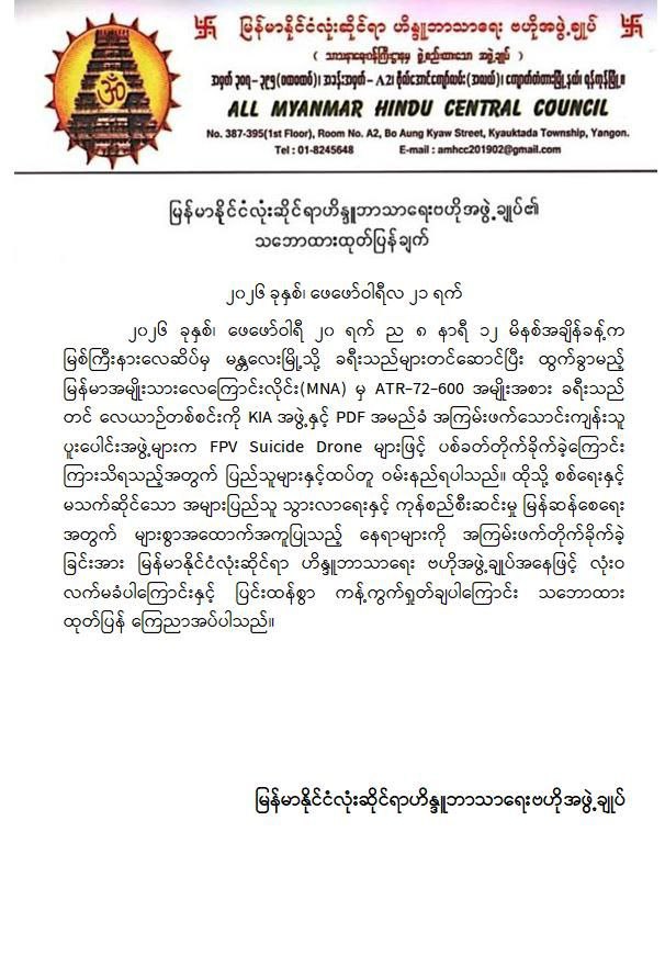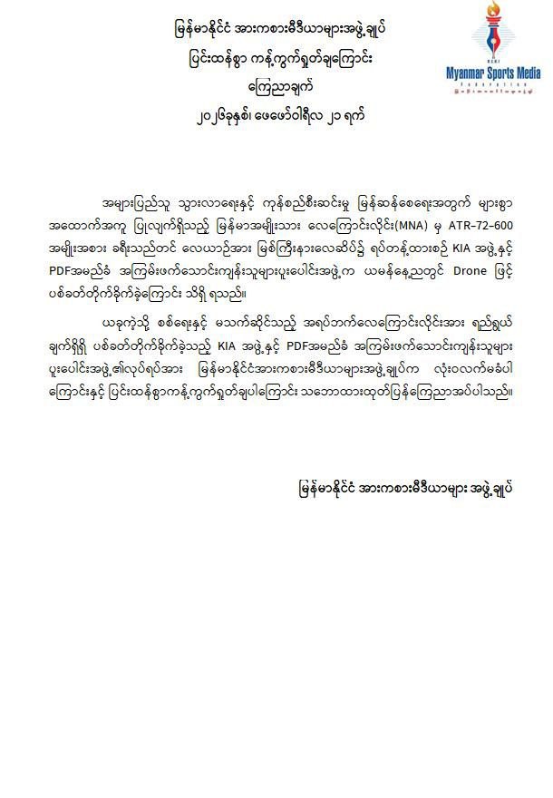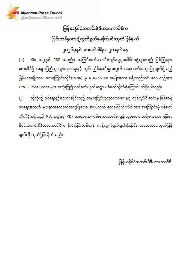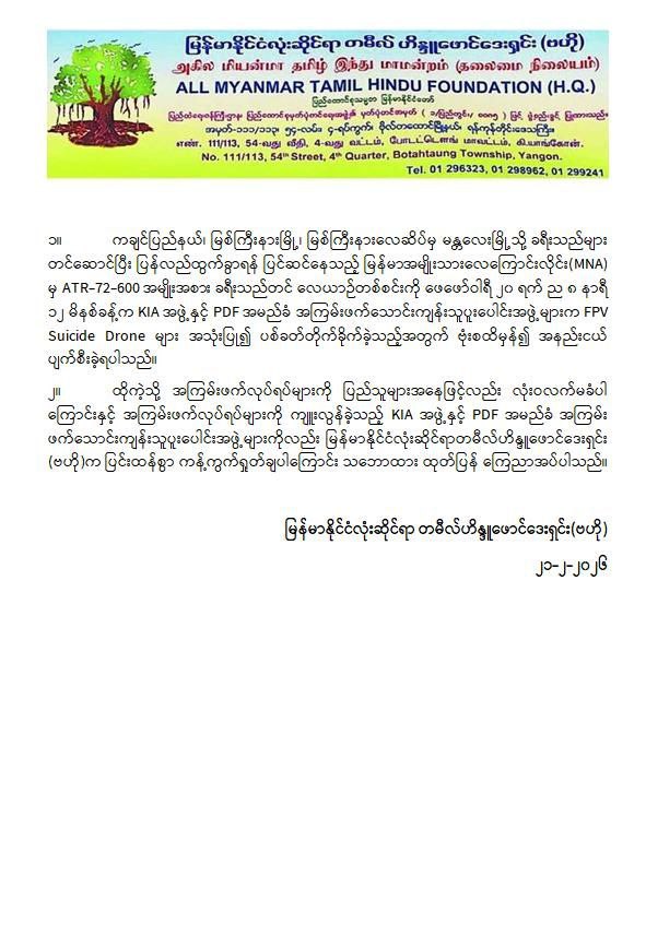 အကြမ်းဖက်အဖွဲ့များအနေဖြင့် စစ်ရေးနှင့်မသက်ဆိုင်သည့် အများပြည်သူ အသုံးပြုလျက်ရှိသော အရပ်ဘက်လေကြောင်းလိုင်းအား ရည်ရွယ်ချက်ရှိစွာဖြင့် တိုက်ခိုက်ခဲ့ခြင်းသည် ဂျီနီဗာကွန်ဗင်းရှင်းများနှင့် အပြည်ပြည်ဆိုင်ရာဥပဒေတို့အရ စစ်ရာဇဝတ်မှု (War Crime) ကို ကျူးလွန်ခြင်းဖြစ်ပြီး ၎င်းတို့၏ အကြမ်းဖက်လုပ်ရပ်များအပေါ် ဒေသခံပြည်သူများအပြင် တစ်နိုင်ငံလုံးရှိ ပြည်သူလူထုတစ်ရပ်လုံးကပါ လုံးဝလက်ခံနိုင်ခြင်းမရှိဘဲ စက်ဆုတ်ရွံရှာစွာ ဝိုင်းဝန်းကန့်ကွက်ရှုတ်ချလျက်ရှိသည်။