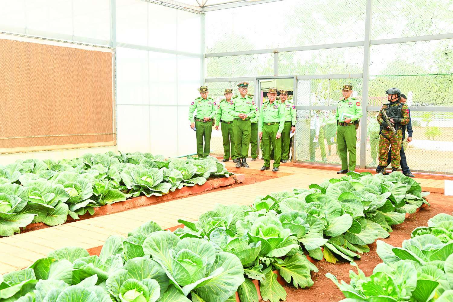 ထို့နောက် နိုင်ငံတော်လုံခြုံရေးနှင့် အေးချမ်းသာယာရေးကော်မရှင် ဒုတိယဥက္ကဋ္ဌ ဒုတိယတပ်မတော်ကာကွယ်ရေးဦးစီးချုပ်၊ ကာကွယ်ရေးဦးစီးချုပ်(ကြည်း)နှင့် အဖွဲ့ဝင်များသည် တိရစ္ဆာန်မွေးမြူရေးနှင့် လေ့ကျင့်ရေးတပ်ရင်းရှိ စံပြစိုက်ပျိုးမွေးမြူရေးဇုန်အတွင်း မြေစိုက်ရေခံအဆောက်အအုံနှင့် လေလုံအအေးပေးအဆောက်အအုံအတွင်း ဥစားကြက်များ မွေးမြူထားရှိမှု၊ Al သားစပ်ခြင်းမှ DYL မျိုးမြင့် သားပေါက်ဝက်များ၊ မျိုးမြင့်ဝက်သိုးနှင့် နို့စားနွားများ မွေးမြူထားရှိမှု၊ နေကြာပန်းများဝန်မှုံကူးမှု လွယ်ကူအဆင်ပြေစေရန်အတွက် ဆီနေကြာနှင့် ပျားအိမ်များ ယှဉ်တွဲစိုက်ပျိုးမွေးမြူထားရှိရာ အောင်မြင်ဖြစ်ထွန်းနေမှု၊ Green House အတွင်း ရာသီသီးနှံများ စိုက်ပျိုးထားရှိမှု၊ မျိုးစေ့ထုတ်ပိုးခန်းအတွင်း ရွှေဖရုံ၊ ဗူး၊ တိုင်ထောင်ပဲ၊ ငရုတ်၊ ရုံးပတီ၊ မုန့်ညင်းနှင့် ခရမ်းများကို မျိုးကောင်းမျိုးသန့်များအဖြစ် အဆင့်ဆင့်မျိုးစေ့များ ထုတ်ပိုးနေမှုနှင့် သိုလှောင်ခန်းအတွင်း မျိုးစေ့များ သိုလှောင်ထားရှိမှု၊ ကျောက်စိမ်း၊ တစ်သျှူး၊ သီးမွှေးငှက်ပျောစိုက်ပျိုးထားရှိမှုများ၊ မျိုးစေ့များ ခင်းကျင်းပြသထားရှိမှု၊ လား/မြင်းချေးမှ သဘာဝမြေဆွေး စမ်းသပ်ထုတ်လုပ်ထားရှိမှုများ၊ ရောဂါကာကွယ်ဆေးများ၊ ထောက်ပံ့နှင့် ပို့ဆောင်ရေးညွှန်ကြားရေးမှူးရုံး ကွပ်ကဲမှုအောက် အစာစပ်စက်ရုံမှ ထုတ်လုပ်သည့် တိရစ္ဆာန်အစားအစာများ ခင်းကျင်းပြသထားရှိမှု၊ ဗထူးစမ်းမှ ဆိုလာရေတင်စနစ်ဖြင့် စိုက်ပျိုးထားသည့် နေကြာ ၁၀ ဧကမှ နေကြာဆီများ ထုတ်လုပ်အောင်မြင်ဖြစ်ထွန်းနေမှုများကို လိုက်လံကြည့်ရှုစစ်ဆေးပြီး သိရှိလိုသည်များကို မေးမြန်းဆွေးနွေးကာ လိုအပ်သည်များအား တာဝန်ရှိသူများနှင့်အတူ ပေါင်းစပ်ညှိနှိုင်းဆောင်ရွက်ပေးသည်။