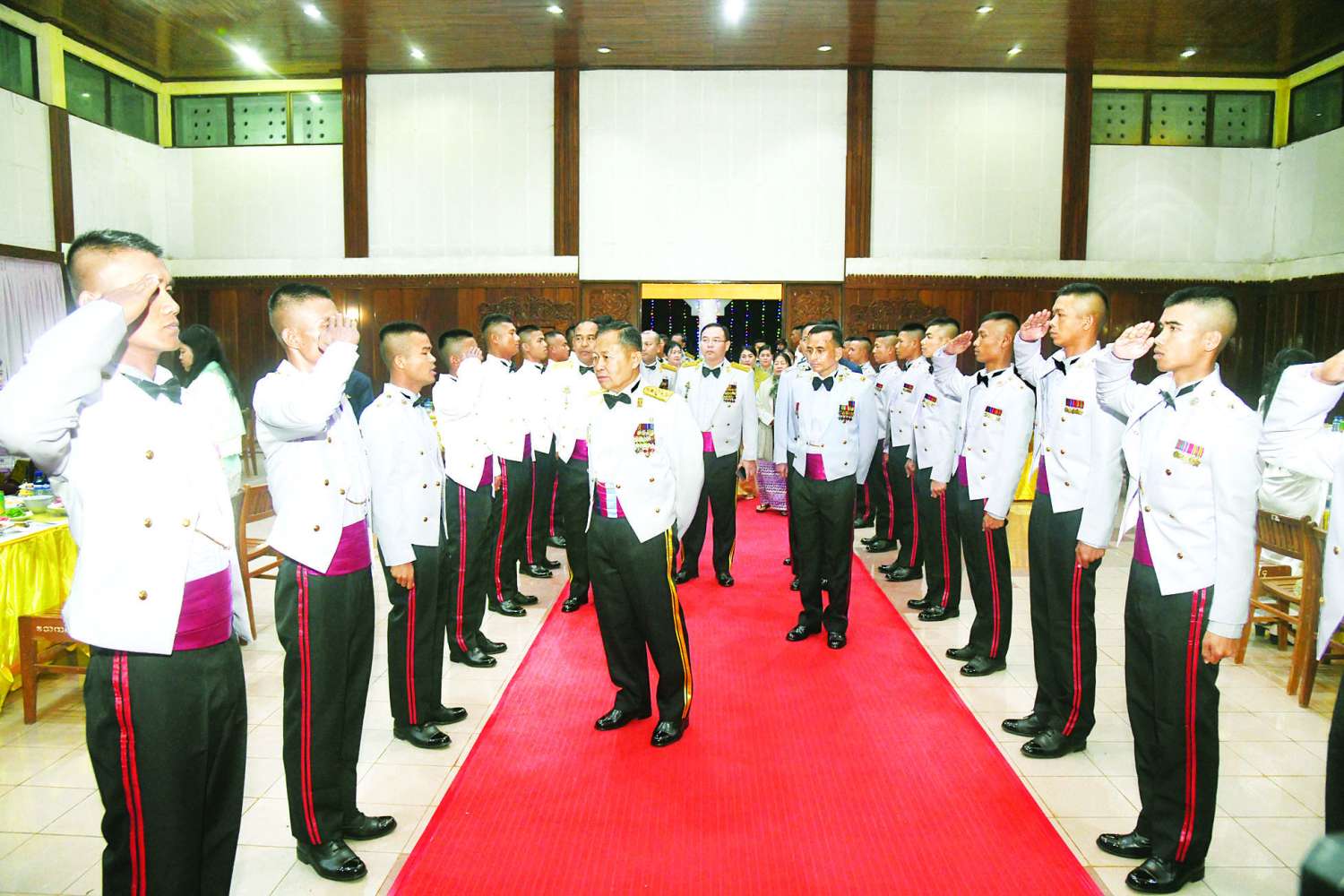 ဦးစွာ နိုင်ငံတော်လုံခြုံရေးနှင့်အေးချမ်းသာယာရေးကော်မရှင် ဒုတိယဥက္ကဋ္ဌ ဒုတိယတပ်မတော်ကာကွယ်ရေးဦးစီးချုပ် ကာကွယ်ရေးဦးစီးချုပ်(ကြည်း)နှင့်အဖွဲ့ဝင်များသည် ကျောင်းဆင်းအရာရှိများအား ရင်းရင်းနှီးနှီးလိုက်လံနှုတ်ဆက်သည်။ ထို့နောက် နိုင်ငံတော်လုံခြုံရေးနှင့်အေးချမ်းသာယာရေးကော်မရှင် ဒုတိယဥက္ကဋ္ဌ ဒုတိယတပ်မတော်ကာကွယ်ရေးဦးစီးချုပ် ကာကွယ်ရေးဦးစီးချုပ်(ကြည်း)နှင့်အဖွဲ့ဝင်များသည် သင်တန်းဆင်းအရာရှိများနှင့်အတူ ညစာကို အတူတကွ သုံးဆောင်ကြသည်။