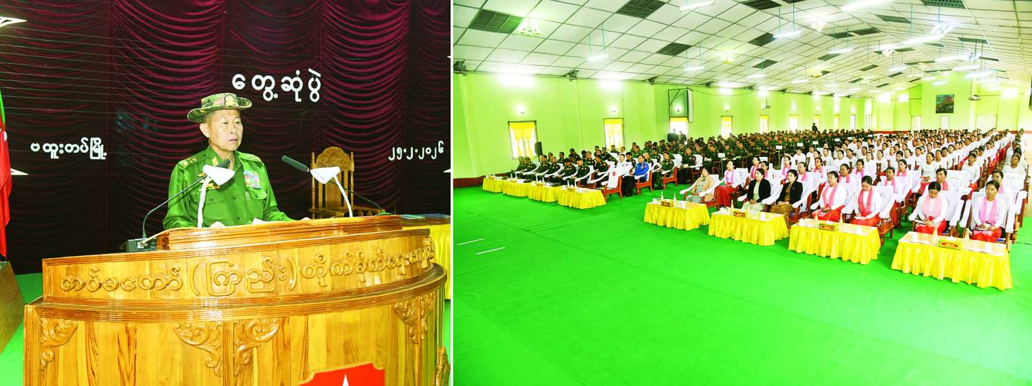 NCA လက်မှတ်ရေးထိုးထားသည့် EAO အဖွဲ့အချို့နှင့် လက်မှတ်ရေးထိုးထားခြင်းမရှိသည့် EAO အဖွဲ့များအနေဖြင့် နိုင်ငံရေးဖြစ်စဉ် မမောက်ကမဖြစ်မှုများကြောင့် နယ်စပ်ဒေသများသို့ ထွက်ပြေးတိမ်းရှောင်လာကြသည့် လူငယ်၊ လူရွယ်များ၊ DCS နိုင်ငံ့ဝန်ထမ်းအချို့တို့အား လူသားချင်းစာနာထောက်ထားမှု အကြောင်းအရာခေါင်းစဉ်အောက်၌ လက်ခံထိန်းသိမ်းပြီး ပြည်ပနိုင်ငံကြီးအချို့၏ ငွေကြေးထောက်ပံ့မှုများရယူကာ အကြမ်းဖက်သင်တန်းများ သင်ကြားပို့ချ၍ လက်နက်များ တပ်ဆင်ပေးကာ အကြမ်းဖက်လုပ်ရပ်များ လုပ်ဆောင်စေရန်မြှောက်ပင့်ပေးမှု၊ တည်ငြိမ်အေးချမ်းရေးကို မလိုလားသည့် ပြည်တွင်း၊ ပြည်ပမှအဖွဲ့အစည်းများ၊ ပြည်ဖျက်မီဒီယာများ၏ သွေးထိုးလှုံ့ဆော်မှုများကြောင့် တရားမဝင်ဖွဲ့စည်းထားသည့် CRPH နှင့် NUG တို့၏ လက်ဝေခံ PDF အမည်ခံအကြမ်းဖက်အဖွဲ့အပါအဝင် အကြမ်းဖက်အဖွဲ့များ ဒေသအလိုက် အမည်အမျိုးမျိုးဖြင့် ပေါ်ပေါက်လာခဲ့ပြီး PDF အမည်ခံအကြမ်းဖက်အဖွဲ့နှင့် အချို့သော EAO အဖွဲ့များ၏ အကြမ်းဖက်လုပ်ဆောင်မှုများကြောင့် တိုင်းရင်းသားဒေသများ၌ တည်ငြိမ်အေးချမ်းရေး၊ တရားဥပဒေစိုးမိုးရေးနှင့် ဒေသဖွံ့ဖြိုးတိုးတက်ရေးတို့ကို ထိခိုက်စေလျက်ရှိပြီး အချို့သောတိုင်းရင်းသားလက်နက်ကိုင်အဖွဲ့များအနေဖြင့်လည်း အဆိုပါအခြေအနေကို အခွင့်ကောင်းရယူပြီး နယ်မြေချဲ့ထွင်နိုင်အောင် ကြိုးပမ်းဆောင်ရွက်နေသည့်အတွက် တပ်မတော်အနေဖြင့် မြန်မာနိုင်ငံရဲတပ်ဖွဲ့ဝင်များ၊ တည်ငြိမ်အေးချမ်းရေးကို လိုလားသည့် ပြည်သူလူထုများနှင့် အတူတကွပူးပေါင်း၍ တရားဥပဒေနှင့်အညီ တိုက်ပွဲဝင်စိတ်ဓာတ်ကို တုံးတိုက်တိုက်၊ ကျားကိုက်ကိုက်စိတ်ဓာတ်၊ လှေခွက်ချည်းကျန်အလံမလဲသည့်စိတ်ဓာတ်တို့ဖြင့် တိုက်ခိုက်ချေမှုန်း နှိမ်နင်းလျက်ရှိပြီး အောင်မြင်မှုများစွာ ရရှိခဲ့ကြောင်း၊ ထိုသို့အောင်မြင်မှုရရှိခြင်းသည် အရာရှိ၊ စစ်သည်၊ ရဲမေတစ်ဦးချင်းစီ၏ စွမ်းရည်များကြောင့်ပငဖြစ်ကြောင်း၊ ထိုသို့တစ်ဦးချင်း၏စွမ်းရည်များရရှိလာအောင် လေ့ကျင့်ရေးသင်တန်းကျောင်းကြီးများကပင် လေ့ကျင့်သင်ကြားပေးခြင်းဖြစ်၍ရှေ့ဆက်၍လည်း နည်းပြများအနေဖြင့် သင်တန်းသားများကို ယခုထက်ပို၍ စနစ်တကျလေ့ကျင့်သင်ကြားပေးသွားကြရန်လိုကြောင်း။