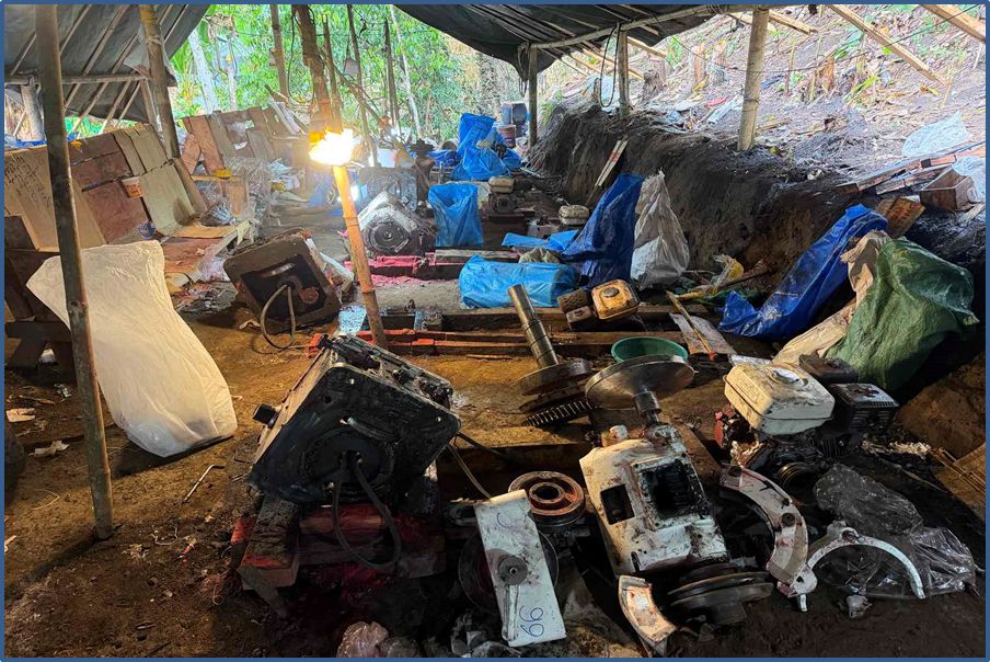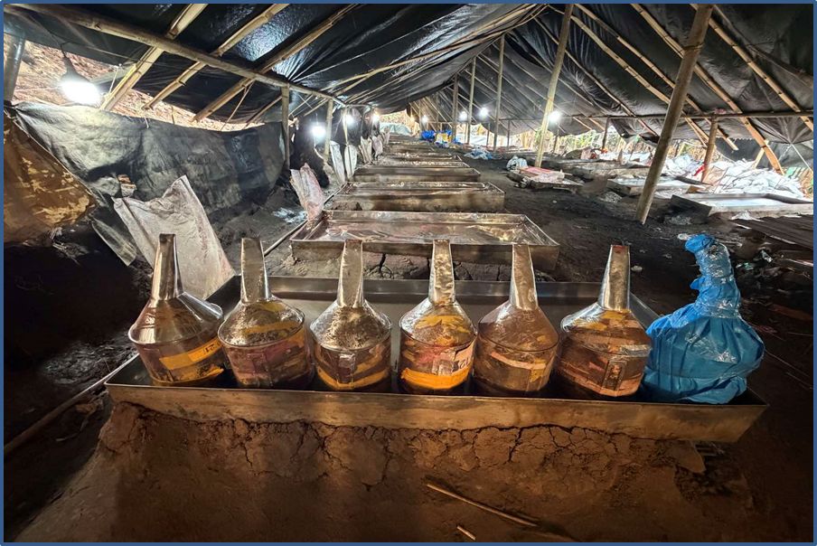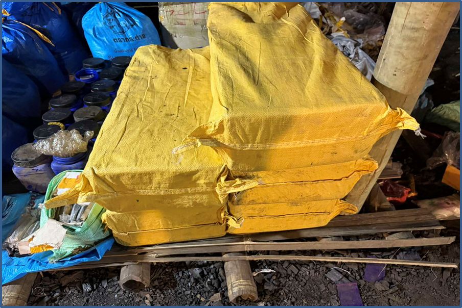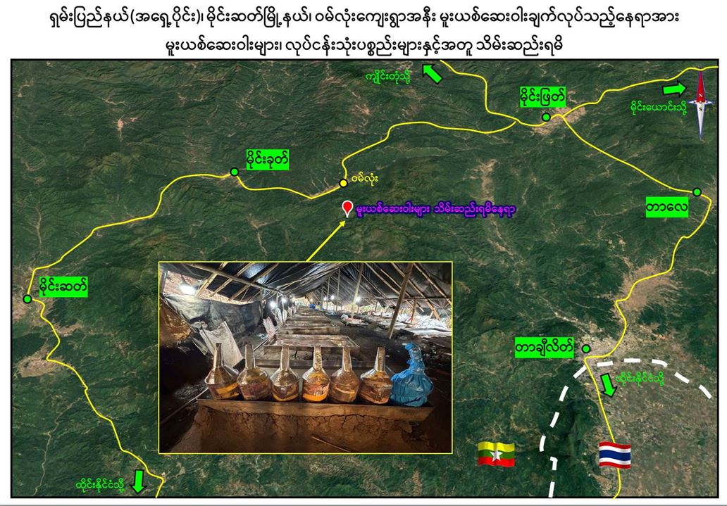 ရှမ်းပြည်နယ်(အရှေ့ပိုင်း)၊ တာချီလိတ်မြို့၏ အနောက်မြောက်ဘက် ၃၀ ကီလိုမီတာခန့်အကွာ၌ မူးယစ်ဆေးဝါးများထုတ်လုပ်နေကြောင်း သတင်းအရ လုံခြုံရေးတပ်ဖွဲ့ ဝင်များပါဝင်သောပူးပေါင်းအဖွဲ့က နယ်မြေရှင်းလင်းခြင်းများ သွားရောက်ဆောင်ရွက်ရာ ဖေဖော်ဝါရီ ၂၄ ရက် မွန်းလွဲ ၂ နာရီခန့်တွင် မိုင်းဆတ်မြို့နယ်၊ မိုင်းခုတ်မြို့၏ အရှေ့တောင်ဘက် ၁၉ ကီလိုမီတာ (ဝမ်လုံးကျေးရွာ၏ တောင်ဘက် ၈ ကီလိုမီတာခန့်) အကွာနေရာ၌ မူးယစ်ဆေးဝါးများနှင့် မူးယစ်ဆေးဝါးချက်လုပ်ရာတွင် အသုံးပြုသည့် ပစ္စည်းများဖြစ်သော Promethazine တံဆိပ်ပါ ချောင်းဆိုးပျောက်ဆေးရည် ၁၀၀ ဘူး (၅၀ ဘူးစီပါ ၂ ဖာ)၊ Food Colour တံဆိပ်ပါ အပြာရောင်ဆေးဘူးအကြီး ၁၈ ဘူးနှင့် ဘူးအသေး ၄၁ ဘူး၊ စိစစ်ဆဲဆေးရည်ပုလင်းအသေး ၅၀၀ လုံး၊ မျောက်ခေါင်း တံဆိပ်ပါအနံ့ဆေးရည် ၁၅ ဖာ (တစ်ဖာလျှင် ဘူး ၂၀ ခန့်)၊ စိစစ်ဆဲအဖြူရောင်အမှုန့် ဆာလာအိတ် တစ်ဝက်ခန့်စီပါ ၆ အိတ်၊ ဘိန်းမည်း ၃ ထုတ်၊ ဘိန်းဖြူဘလောက်တုံး ၁ တုံး၊ စိစစ်ဆဲ အနက်ရောင် အထုတ် ၁ ထုတ်၊ အဖြူရောင်ပုံဆောင်ခဲ ၁ ကီလိုဂရမ်စီပါ ၉ ထုတ်၊ တိပ်ဝါများပိတ်ထားသည့် WY ဆေးပြား ၆၀၀၀ ပြားခန့်ပါ ၁၂ စည်း၊ ၉၉၉ တံဆိပ်ပါ တိပ်ဝါပတ်လျက် WY ဆေးပြား ၁၀၀၀၀ ခန့်ပါ ၁၀ စည်း၊ ထုတ်ပိုးရခြင်းမရှိသေးသည့် WY ဆေးပြား ဆာလာအိတ် တစ်ဝက်ခန့်စီပါ ၁၂ အိတ်၊ WY ဆာလာအိတ် တစ်ဝက်ခန့်စီထည့်ထားသည့် ဆေးပြားထုတ်လုပ်ရာတွင် အသုံးပြုသည်ဟုယူဆရသည့် ဆေးမှုန့် ၁၂ အိတ်၊ ရိုက်တံမို ၂ ဖာနှင့် ဆက်စပ်ပစ္စည်းများ ထည့်သွင်းထားသည့် အပြာရောင်ဘူးကြီး ၁၄ ဘူး၊ ကီလိုချိန်စက် ၃ လုံး၊ မီးစက်အကြီး ၁ လုံး၊ မွှေစက်အသေး ၃ လုံးနှင့် အခြောက်ခံဗန်းဆိုဒ်စုံ ၃၂ ခုတို့ကို တွေ့ရှိသိမ်းဆည်း ရမိခဲ့ကြောင်းသိရှိရသည်။