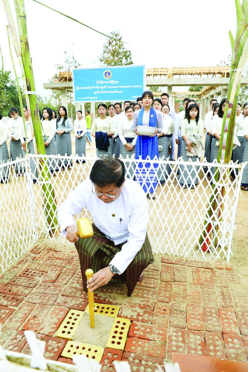 ဦးစွာ ပြည်ထောင်စုဝန်ကြီး၊ ဒုတိယဝန်ကြီးများနှင့် Mother Development Co.,Ltd. မှ တာဝန် ရှိသူများက သတ်မှတ်နေရာများတွင် ပန္နက်တိုင်များ စိုက်ထူပေးကာ အမွှေးနံ့သာရည်ဖြင့် ပက်ဖျန်းပေးကြသည်။