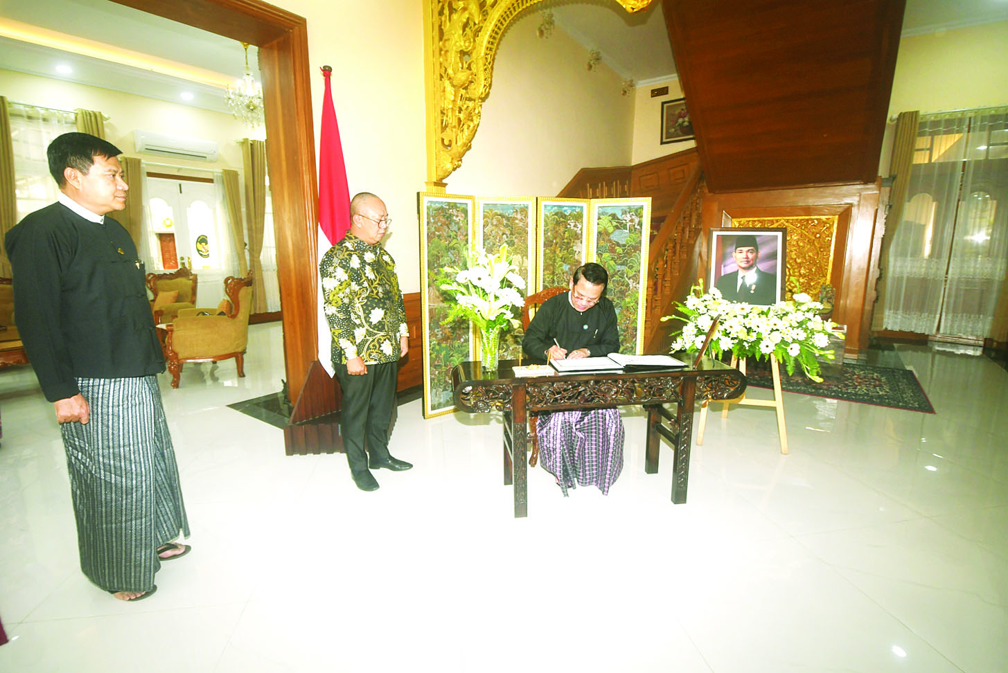 ဦးစွာ ပြည်ထောင်စုဝန်ကြီးသည် အင်ဒိုနီးရှားနိုင်ငံသံရုံးမှ သံရုံးယာယီတာဝန်ခံနှင့် တာဝန်ရှိ သူများအား သံရုံးဧည့်ခန်းမတွင် တွေ့ဆုံနှုတ်ဆက်၍ အင်ဒိုနီးရှားသမ္မတနိုင်ငံ ဒုတိယသမ္မတဟောင်း H.E. Mr. Try Sutrisno ကွယ်လွန် ခဲ့ခြင်းအပေါ် ပြည်ထောင်စုသမ္မတမြန်မာနိုင်ငံအစိုးရကိုယ်စား ဝမ်းနည်းကြောင်းနှင့် စာနာထောက်ထားပါကြောင်း သတင်းစကားပြောကြားပြီး ဝမ်းနည်းကြောင်း မှတ်တမ်းစာအုပ်တွင် လက်မှတ်ရေးထိုးသည်။
