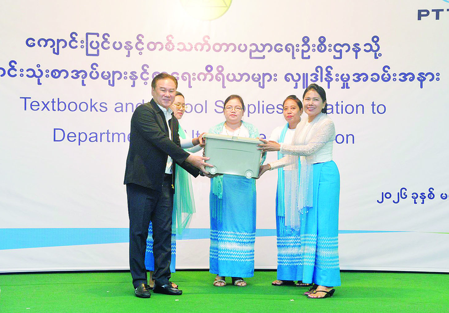 ထို့နောက် PTTEP Myanmar မှ General Manager က ကျောင်းသုံးစာအုပ်များနှင့် စာရေးကိရိယာ များကို ပေးအပ်လှူဒါန်းရာ ကျောင်းပြင်ပနှင့် တစ်သက်တာပညာရေးဦးစီးဌာန ညွှန်ကြားရေးမှူး (NFME) ဒေါက်တာချိုချိုဝင်းက လက်ခံရယူကြောင်း သိရသည်။