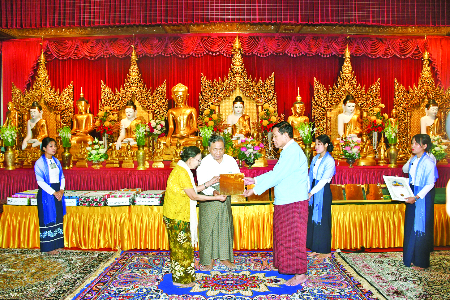 ထို့နောက် ရွှေတိဂုံစေတီတော်ဘဏ္ဍာတော်ထိန်း ဂေါပကအဖွဲ့၏ ဩဝါဒါစရိယ တိပိဋက ရွေးချယ်ရေးအဖွဲ့ ဩဝါဒါစရိယ နိုင်ငံတော်ဗဟိုသံဃာ့ဝန်ဆောင် အဂ္ဂမဟာပဏ္ဍိတ အဂ္ဂမဟာဂန္ထဝါစကပဏ္ဍိတ အဂ္ဂမဟာသဒ္ဓမ္မဇောတိကဓဇ၊ သ.စ.အ ဓမ္မာစရိယ ဝဋံသကာပါဠိပါရဂူ စေတိယင်္ဂဏပဝရသိရီမဟာ ဓမ္မဂုရု ဘဒ္ဒန္တနာရဒါဘိဝံသ (လှရတနာဆရာတော်) ထံမှ ငါးပါးသီလခံယူဆောက်တည်ကြပြီး ရေစက်ချ အနုမောဒနာတရား နာယူကြကြောင်း သိရသည်။