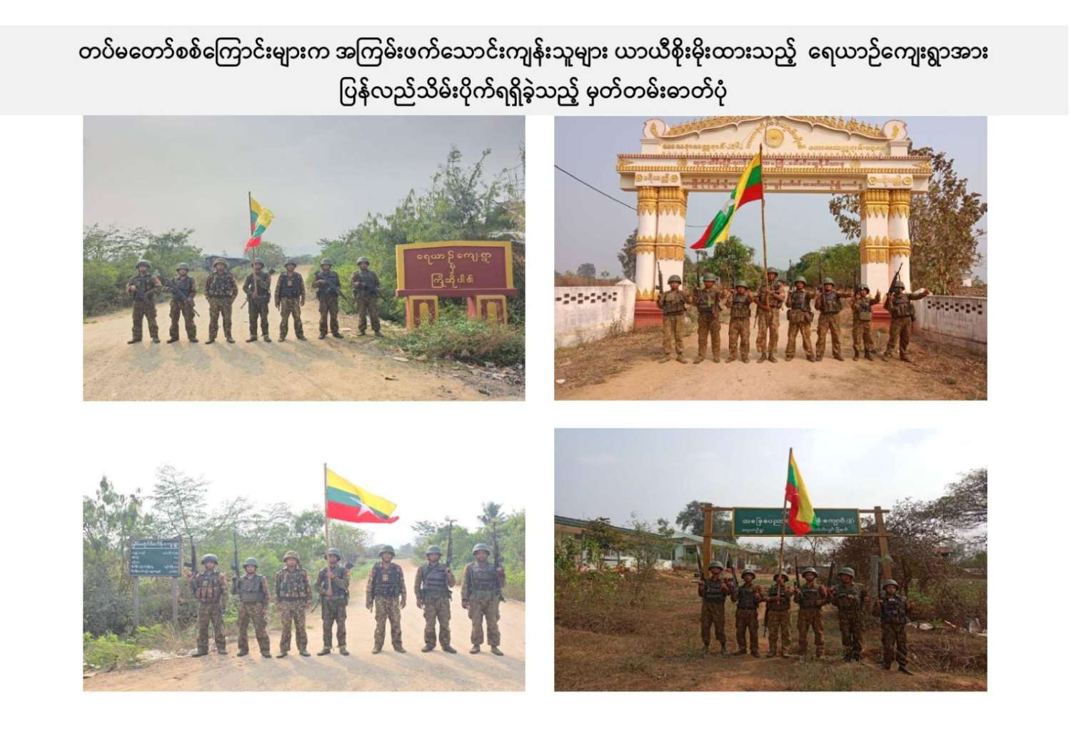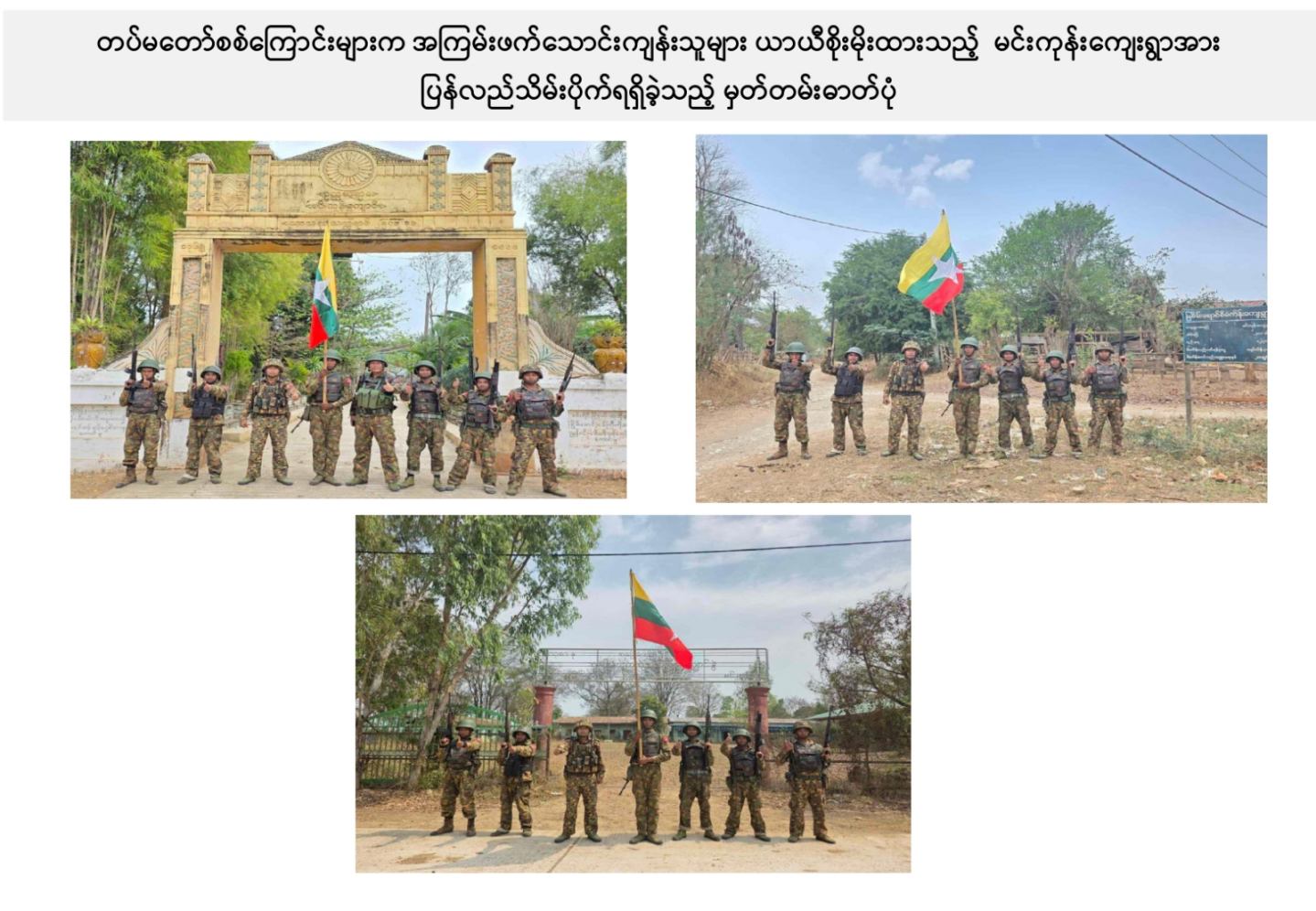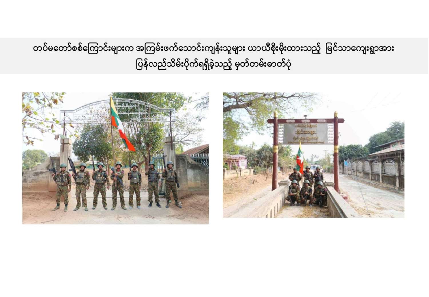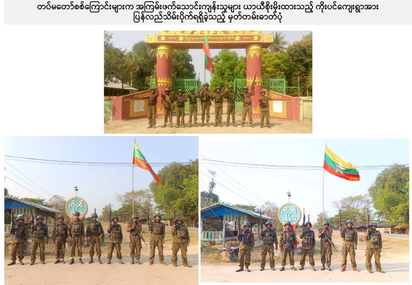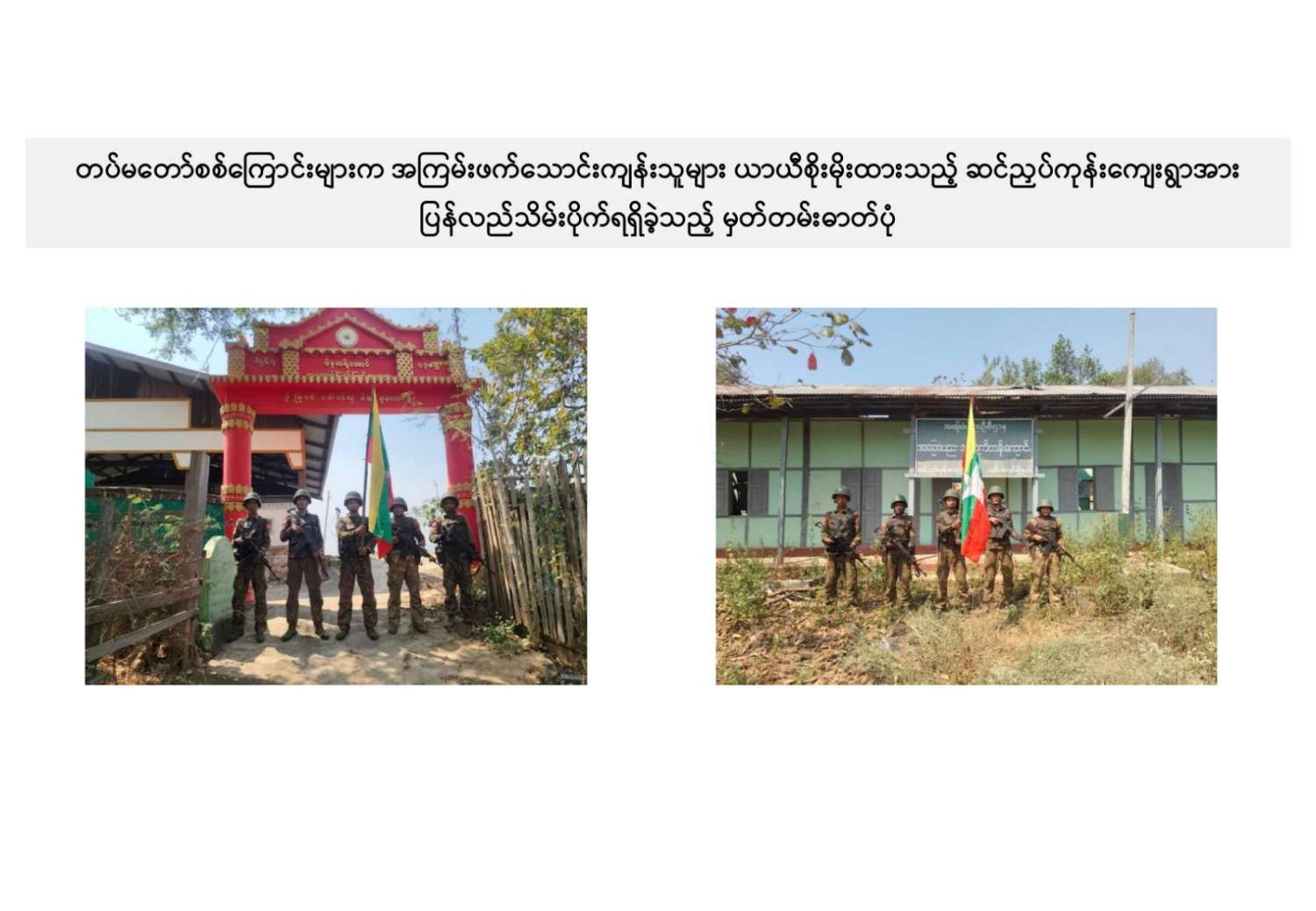 ယခုကဲ့သို့ တကောင်းမြို့နှင့် အဆိုပါပတ်ဝန်းကျင်ဒေသ၏ လုံခြုံရေး၊ ဒေသခံပြည်သူလူထု လိုလားတောင့်တလျက်ရှိသည့် ပြည်သူလူထု၏ လူမှုစီးပွားဘဝလုံခြုံခိုင်မာစေရေးအတွက် ရွပ်ရွပ်ချွံချွံ ဆောင်ရွက်ပေးနိုင်ခဲ့သည့် ရှေ့တန်းရောက် တိုက်ပွဲဝင်တပ်မတော်သား အရာရှိ၊ အရာခံ၊ အကြပ်၊ စစ်သည်များ၊ အလားတူ ရှေ့တန်းစစ်ဆင်ရေးတာဝန်များ ထမ်းဆောင်လျက်ရှိသော တိုက်ပွဲဝင် တပ်မတော်သားအတွက် အောင်နိုင်စိတ်၊ တိုက်ပွဲဝင်လိုစိတ်စသည့် စိတ်ဓာတ်ခွန်အားအပါအဝင် လိုအပ်သည့် ကူညီထောက်ပံ့မှုများကို မဆုတ်မနစ်သော ယုံကြည်ချက်ဖြင့် ဖြည့်ဆည်းပေးလျက်ရှိသော တပ်မတော်သား မိသားစုဝင် ပါရမီဖြည့်ဖက်များနှင့် တပ်မတော်ကို အားပေးထောက်ခံခဲ့ကြသူအားလုံးကို လေးစားစွာ အသိအမှတ်ပြု ကျေးဇူးတင်ရှိပါကြောင်းနှင့် တကောင်းမြို့နှင့် ၎င်းဒေသတစ်ဝိုက်အား တပ်မတော်က ပြန်လည်သိမ်းပိုက်နိုင်ခဲ့သည့်သတင်းအား ပြည်သူ့ဆက်ဆံရေးနှင့် စိတ်ဓာတ်စစ်ဆင်ရေး ညွှန်ကြားရေးမှူးရုံး ကွပ်ကဲမှုအောက် မြဝတီရုပ်မြင်သံကြားအဖွဲ့သားများက ဂုဏ်ယူစွာဖြင့် သတင်းထုတ်ပြန်အပ်ပါသည်။